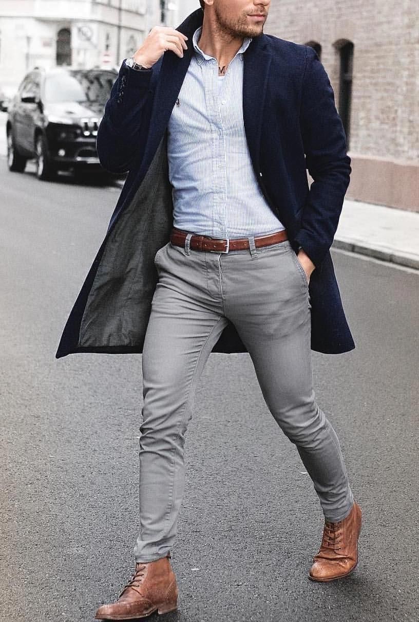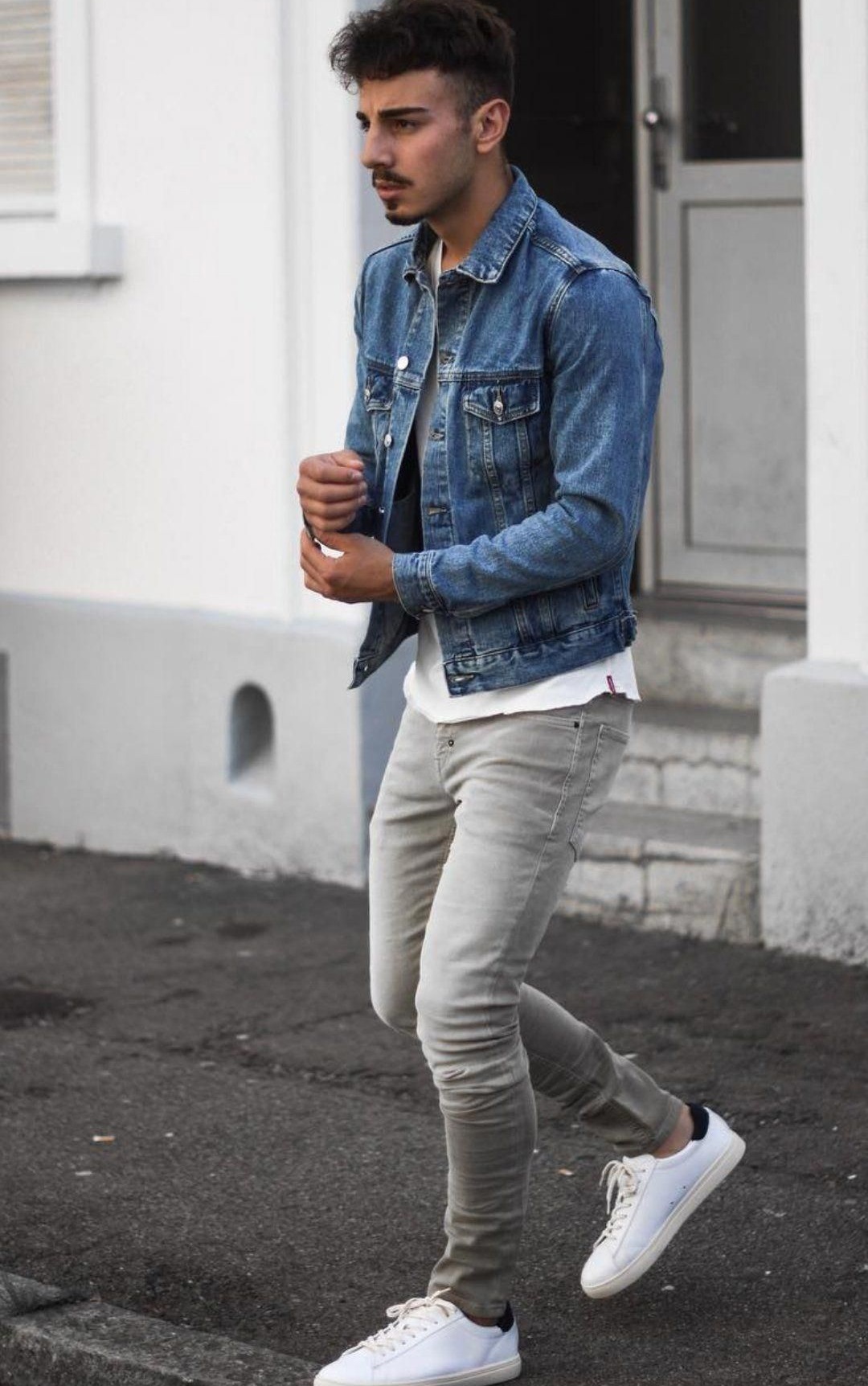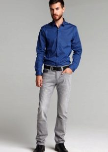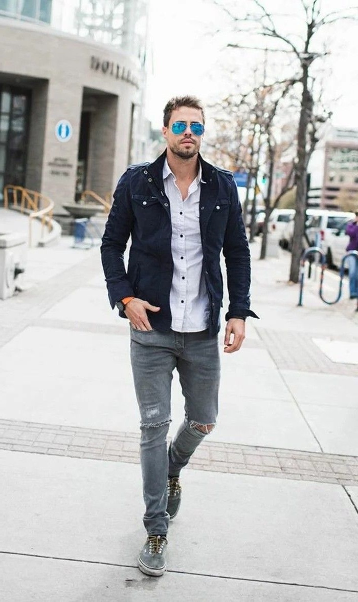 Сивите дънки са идеални за по -официална визия. Тъмно синьо яке и обувки от същия нюанс ще направят външния ви вид стилен и лаконичен.