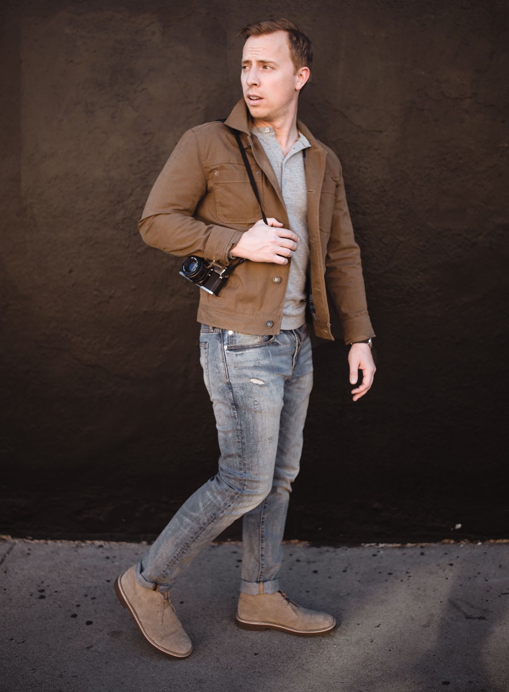Сивите проблемни дънки ще допълнят добре бяла риза и кафяво яке.