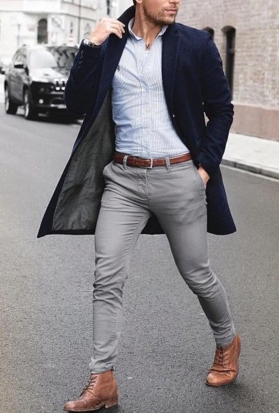 Сдвояването на сиви тесни дънки със светлосиня риза на райе и тъмно палто е друг тоалет.