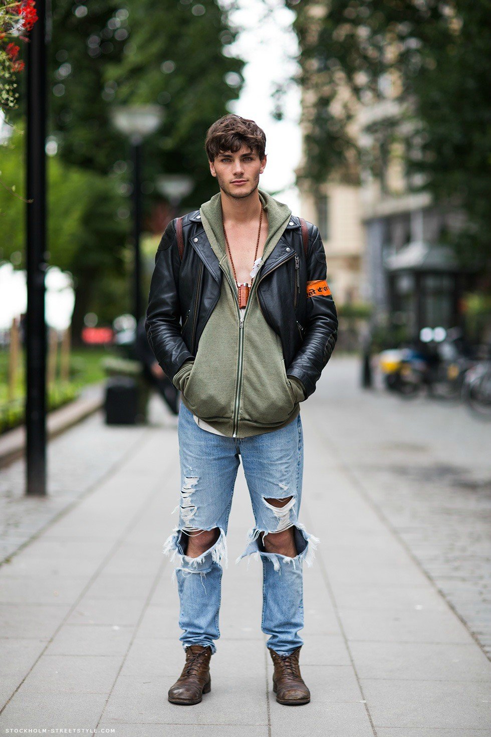 - Дънките с цепки се съчетават добре с черно яке и брутални обувки.