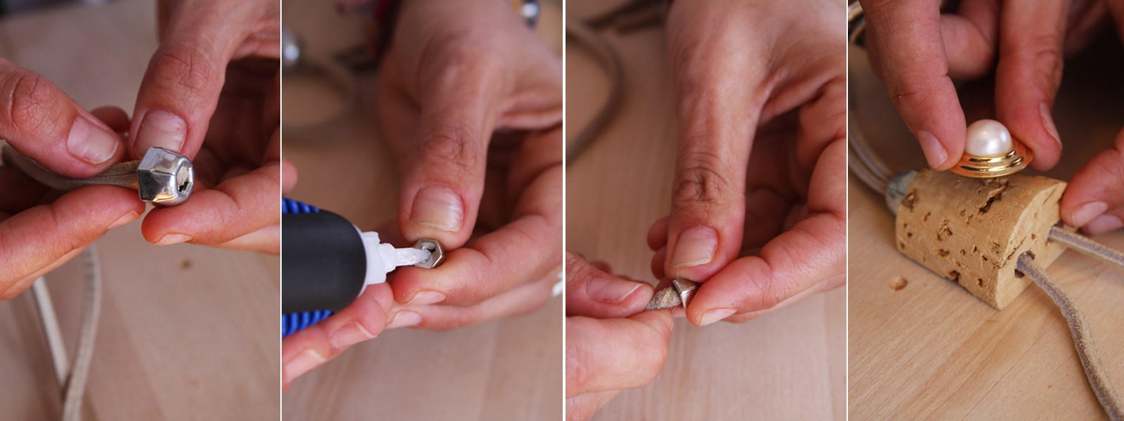 - през отворите на копчетата се вкарва дантела - те се навиват отзад и се изваждат отпред;