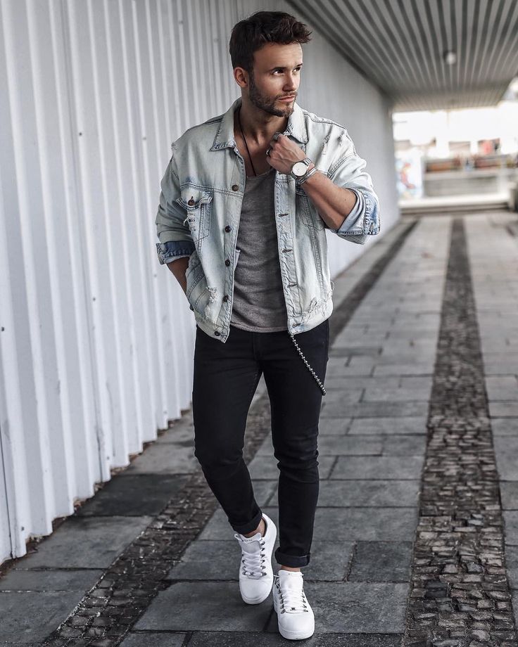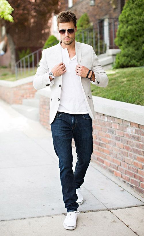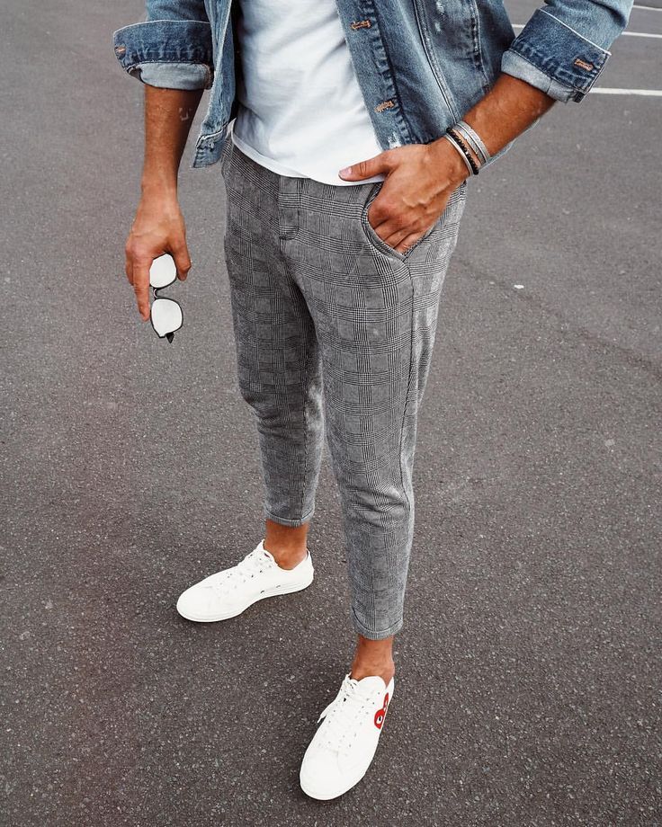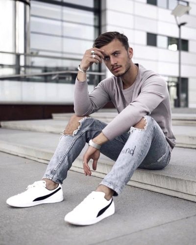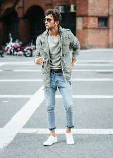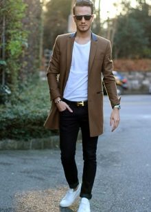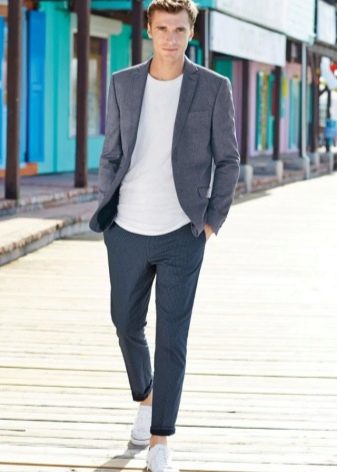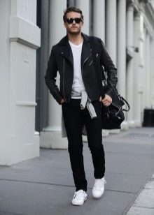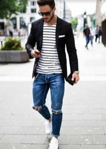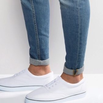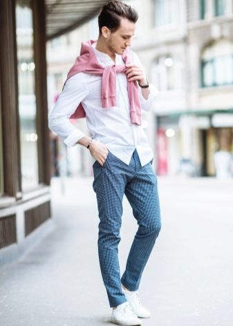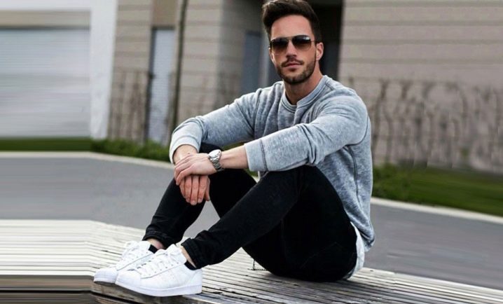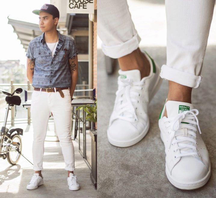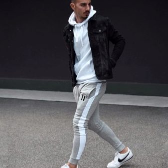Дънките се считат за печеливш вариант за спортни обувки - те самите са чудесен акцент за създаване на успешен външен вид. За мъжете с наднормено тегло е по-добре да изберете модели панталони с права кройка или широки модели. Останалите могат да останат на тесни, тесни или скъсани дънки, гаджета. За горната част можете да изберете ризи, тениски, както и якета, качулки и пуловери.