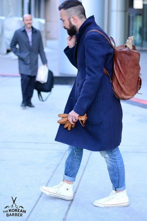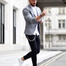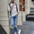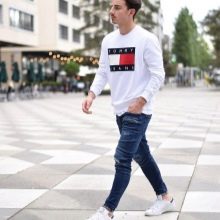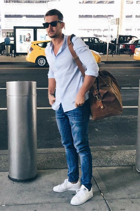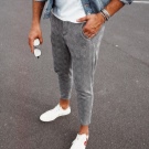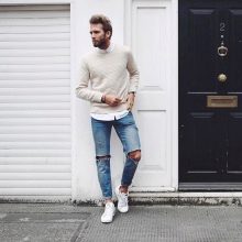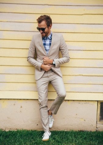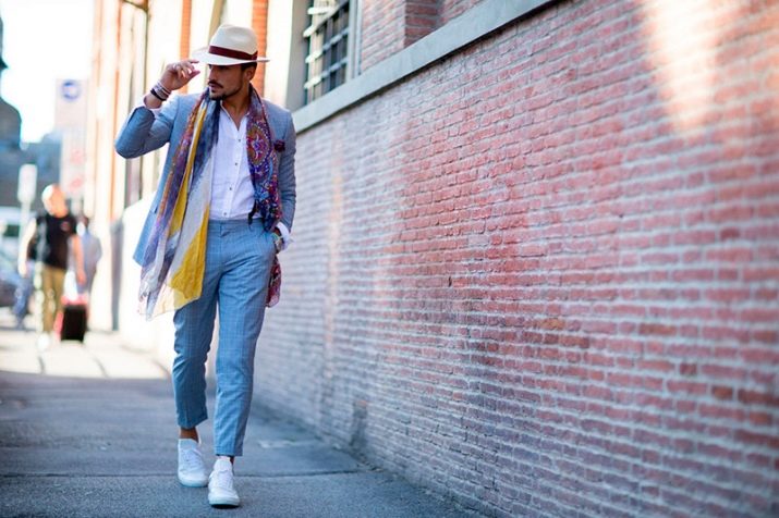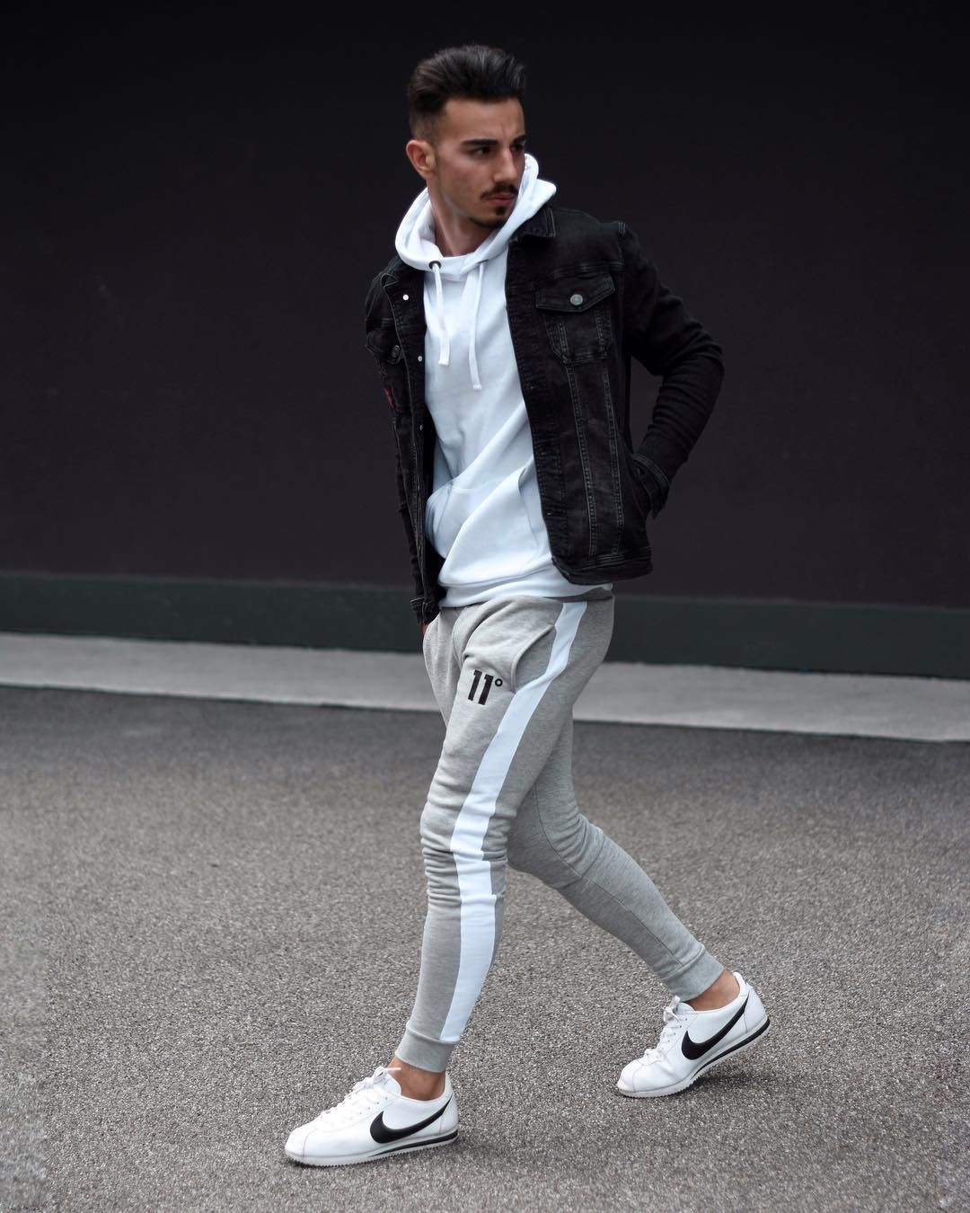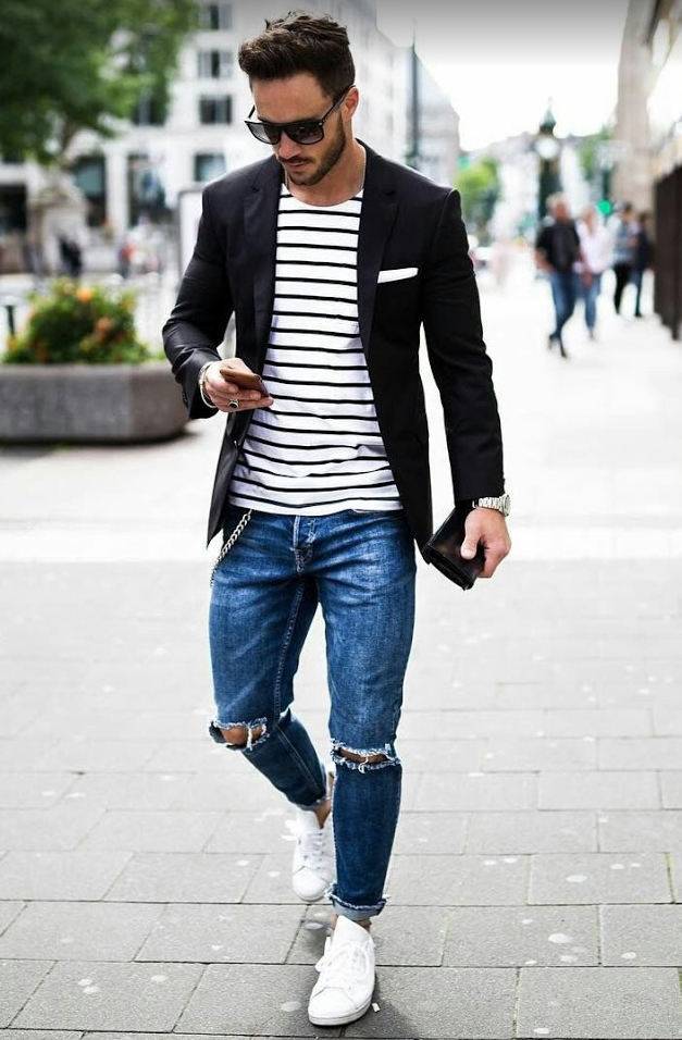 Дънките се считат за печеливш вариант за спортни обувки - те самите са чудесен акцент за създаване на успешен външен вид. За мъжете с наднормено тегло е по-добре да изберете модели панталони с права кройка или широки модели. Останалите могат да останат на тесни, тесни или скъсани дънки, гаджета. За горната част можете да изберете ризи, тениски, както и якета, качулки и пуловери.
