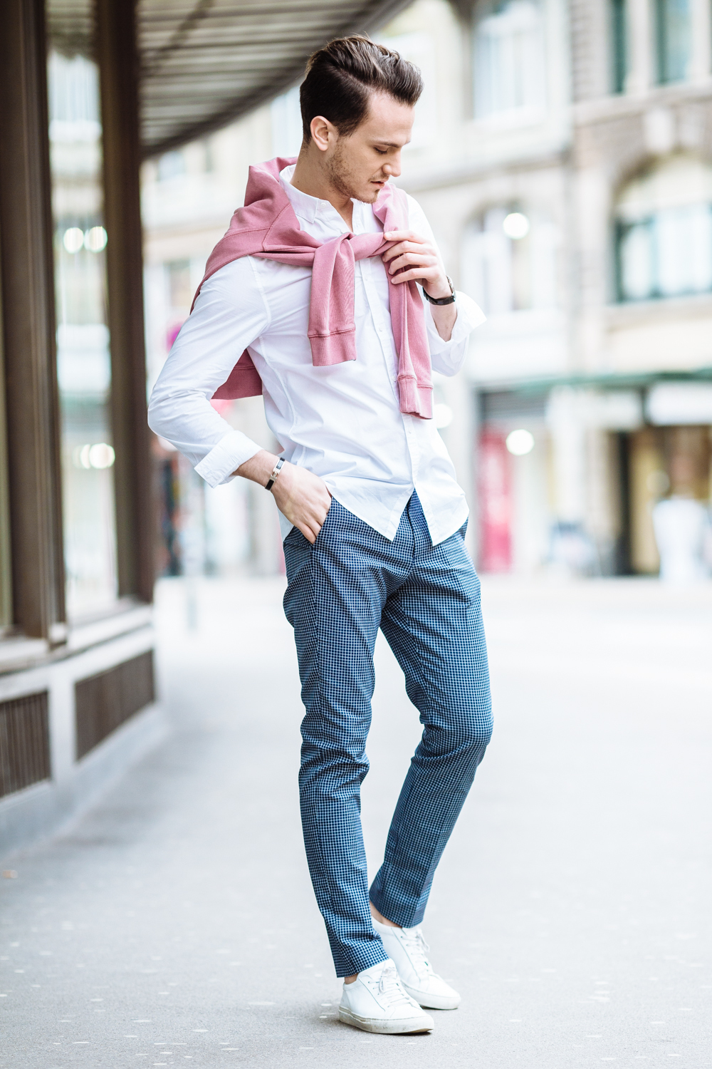 Ансамбъл от леки обувки за тенис и ярки тесни панталони с бяла риза ще добавят елегантност към вашата визия и ще подчертаят деловия стил.