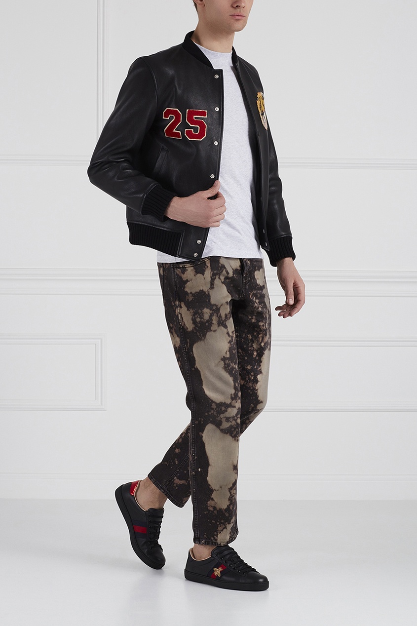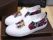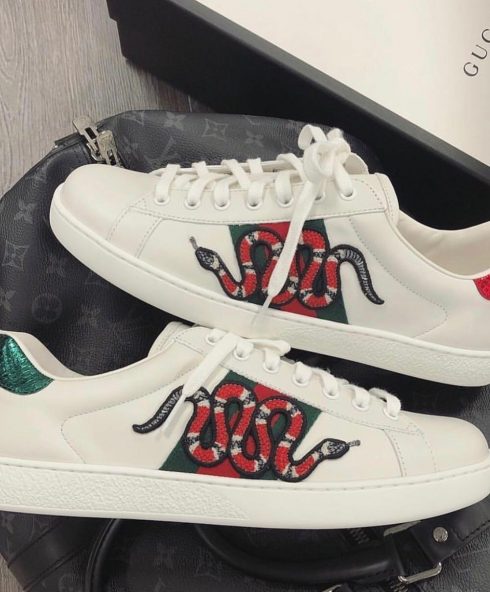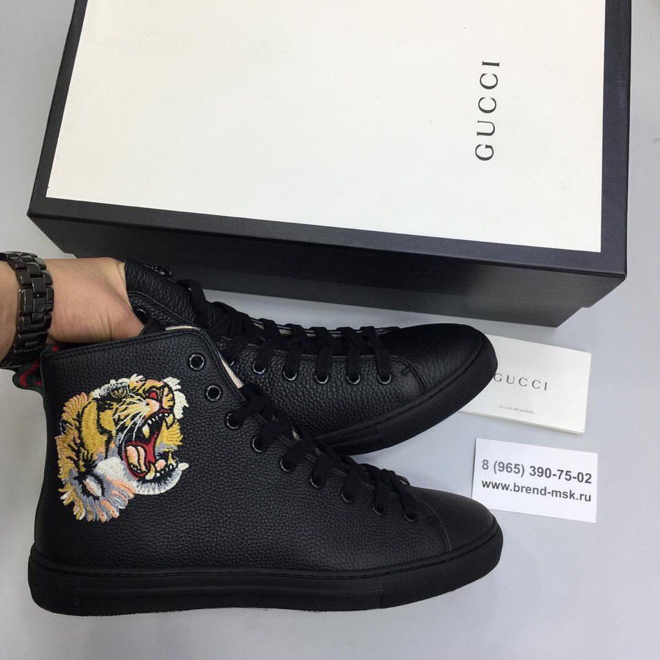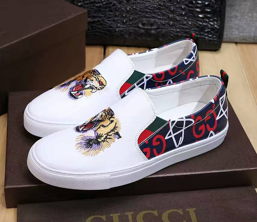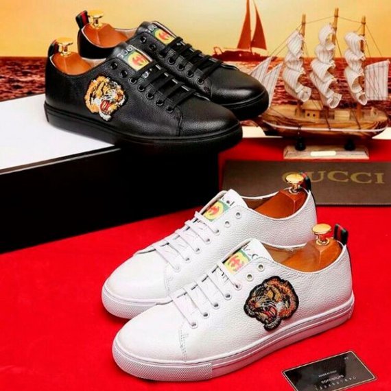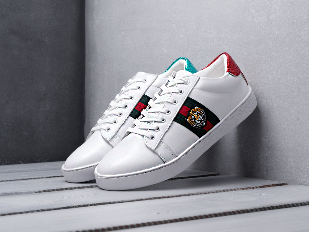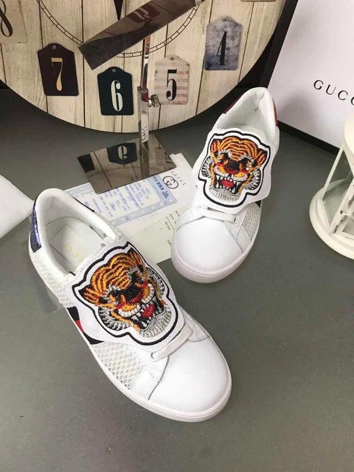 В редица Нов ас на Gucci са представени модели в анималистичен стил. Продуктите с изображение на тигър са много популярни. За по -мъжествено докосване изберете бели обувки с черен тигров принт.