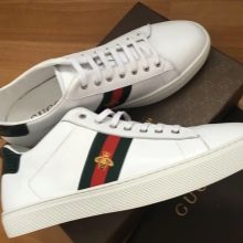 - Бели обувки от Gucci е в голямо търсене сред всички слоеве от населението. Белите кецове вървят добре с всеки лък. Снежнобял нюанс благоприятно ще допълни композицията, правейки изображението по-свежо и привлекателно. При производството на модерни бели спортни обувки от този производител естествената кожа се използва не само за горната част на продукта, но и за интериорната декорация, което влияе благоприятно върху качеството на износване и комфорта.Трудно е да се намерят напълно обикновени маратонки от тази марка, обикновено дизайнерите разреждат цвета, като добавят контрастни елементи под формата на връзки, петна или фирмено лого. Разпознаваемата червена и зелена емблема с лого на пчелите, лъскавият брояч на петите или бродерията допълват продукта, изпъквайки на бял фон.