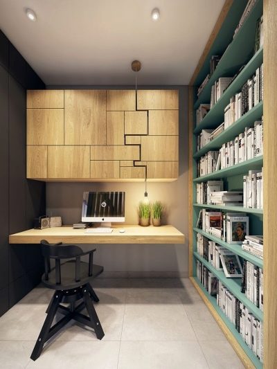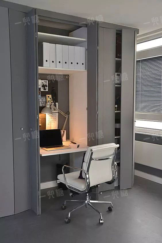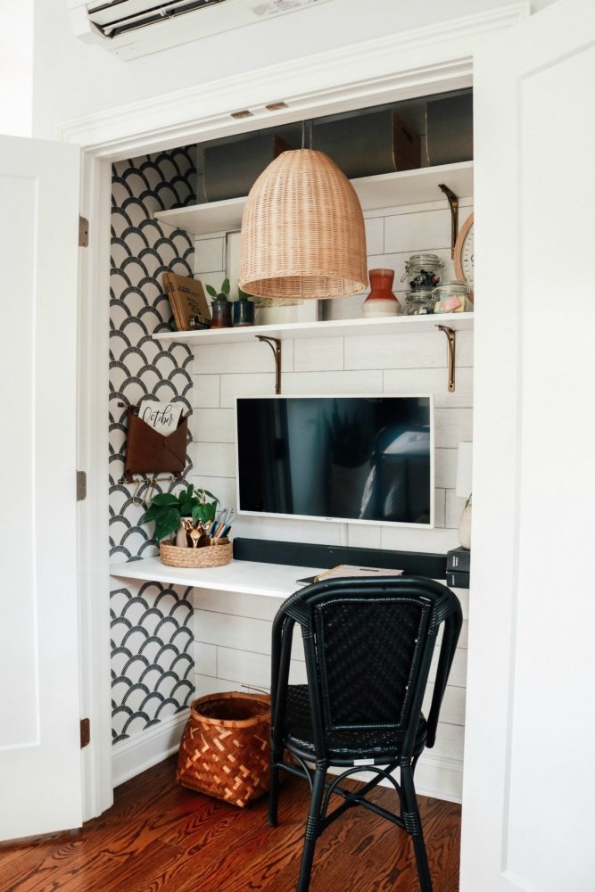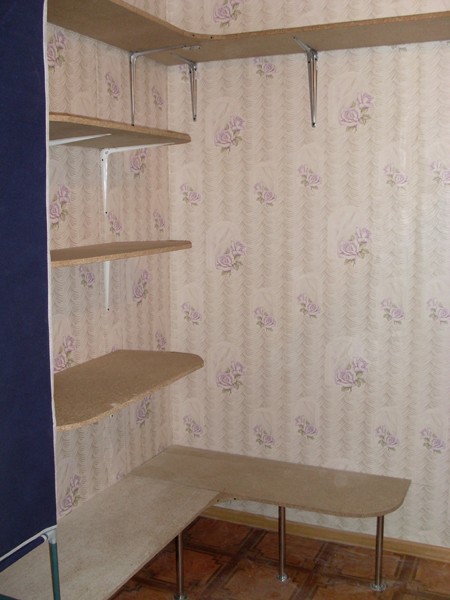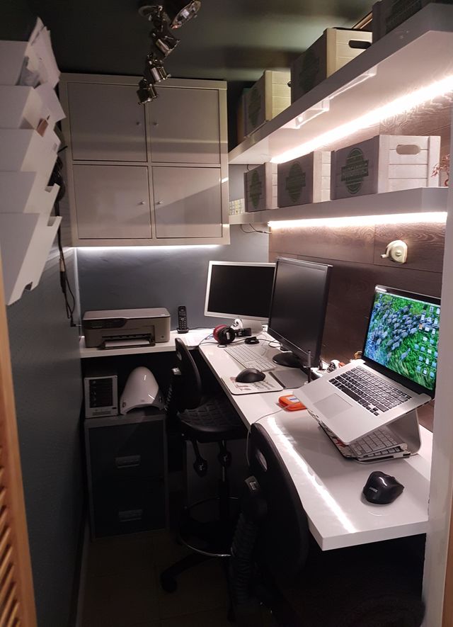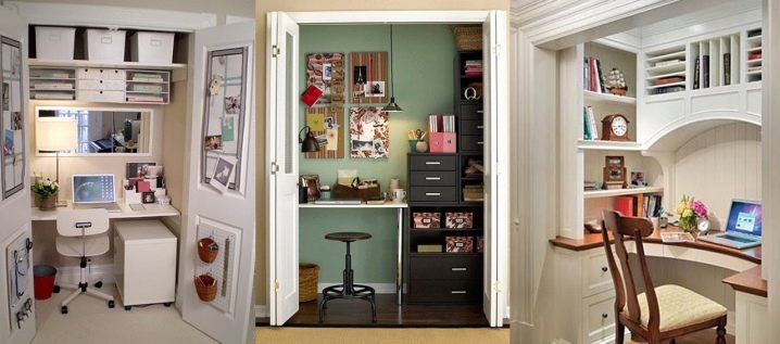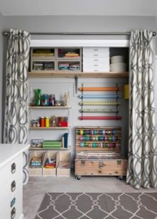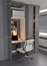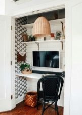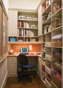 Тихо място, където можете да се скриете от всички и да работите тихо, е необходимо за мнозина. Ако имате повече или по -малко просторна килер, можете да поставите малка работна маса, стол, стелаж там. Ако имате много документи, книги и други неща, висящите рафтове ще ви спестят на малко пространство. Можете да поставите всичко необходимо на тях. Разбира се, ще трябва да помислите и за осветлението.