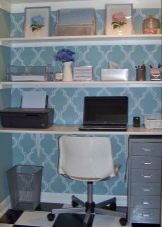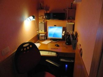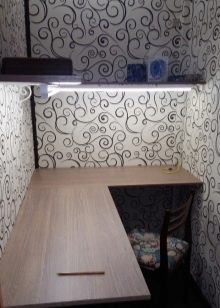 - И тук е случаят, когато в килера успешно се настаниха работна зона... Високата стойка съдържа всички необходими документи. Компактна маса е достатъчна за работа. Осветлението също е замислено, за да го направи удобно за работа.