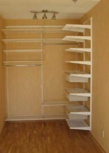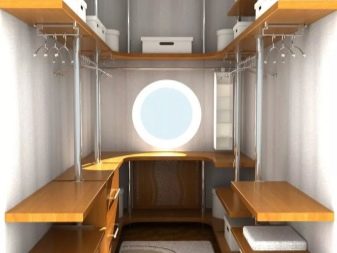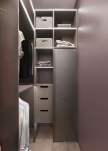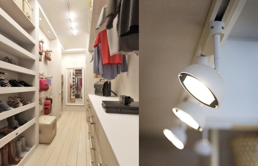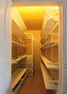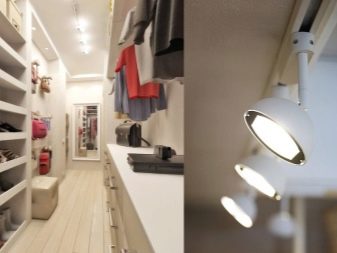Светлината в такава стая играе различна роля. Ако това са рафтове за съхранение на неща, тогава една лампа на тавана ще бъде достатъчна. Самите рафтове могат да бъдат оборудвани с фенерчета, прожектори. Това ще ви помогне да поставите нещата удобно в стаята и най -важното - да намерите това, от което се нуждаете.