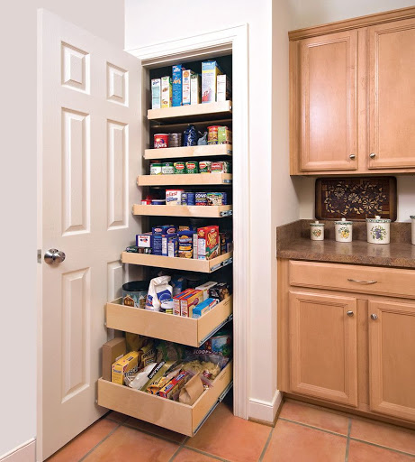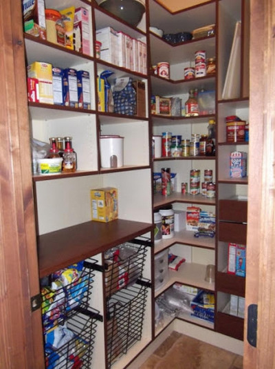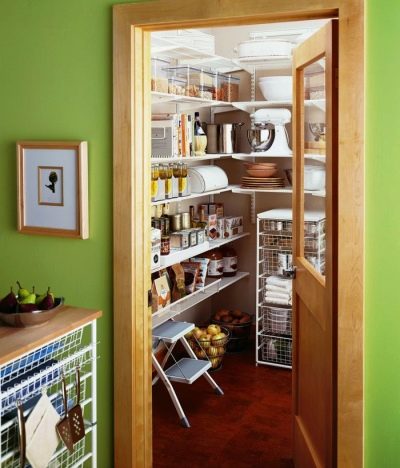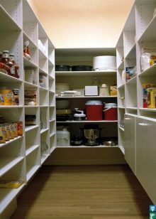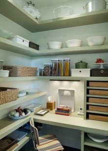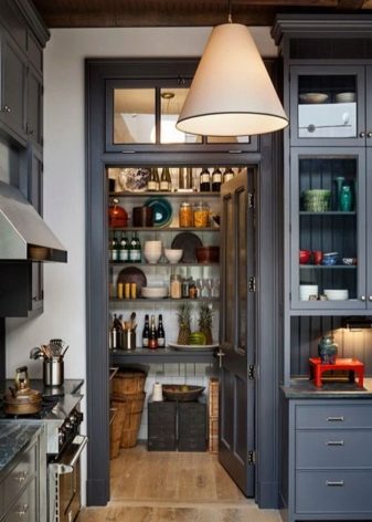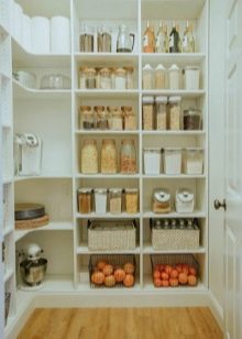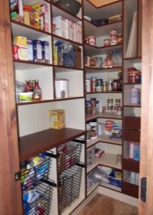 Тази опция е поставена в кухнята. Вътре те оборудват дървени рафтове, стенни шкафове, осигуряват кутии, в които е удобно да се съхраняват пресни зеленчуци и плодове. Буркани с кисели краставички и консерви се съхраняват по рафтовете. За насипни продукти можете да оборудвате специални шкафове, където ще бъдат поставени всички кутии и контейнери.