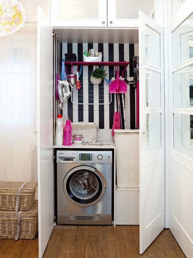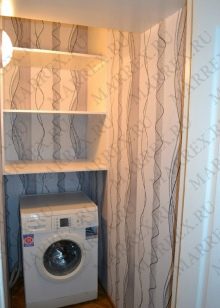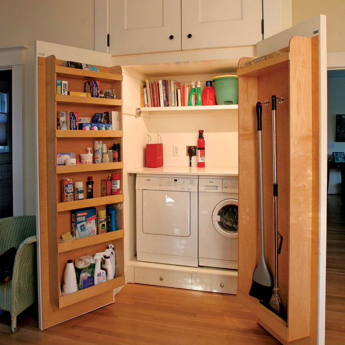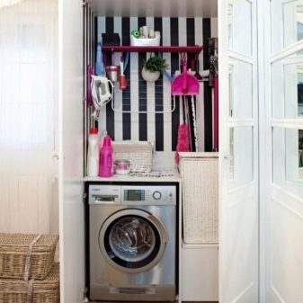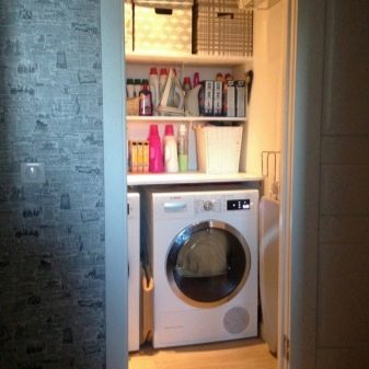 Най -често такива килери помагат за решаването на проблема с пералня, която не се побира никъде. Тук можете също да поставите всичко необходимо за измиване... Рафтовете по стените ще ви бъдат полезни, за да поставите там перилни и почистващи препарати.