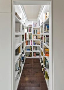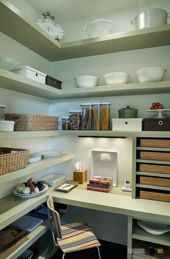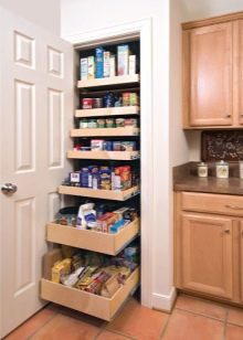 - Малка килер в кухнята много удобно разположени, всички неща винаги са под ръка. Въпреки компактните си размери, всичко е разположено тук, така че можете да съхранявате много неща. Рафтовете до тавана помагат да се поставят много предмети; за удобство е предвидена малка стълба. Тези, които се изискват по -често, се намират в долната част. Кошниците и кутиите са добро допълнение.