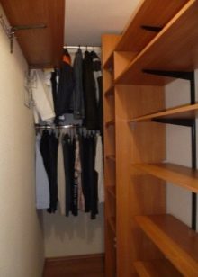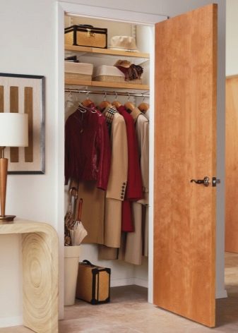 - Малка съблекалня може да изглежда така. Има възможност да закачите неща на закачалки, има много рафтове за обувки. По -горе - тези неща, които се използват най -рядко.