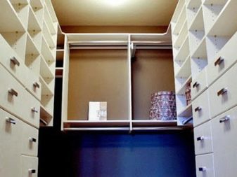 Най -често такава стая ще бъде по -добре оборудвана в спалнята.... Вътре си струва да поставите рафтове за обувки, шкафчета за неща, закачалки за връхни дрехи, рокли и костюми. В този случай всичко ще се поддържа в перфектен ред. Вратата към килера трябва да се комбинира с цялостния дизайн на спалнята, щорите или ролетни щори биха били добър вариант, в някои случаи дори можете да помислите за завеси. Понякога в съблекалните, ако има място, можете да инсталирате фотьойл и маса. В крайна сметка не винаги е възможно да се реши какво да се облече. И в процеса на почистване се нуждаете от почивка. Фитингите също са незаменими тук, така че голямо огледало с добро осветление ще бъде задължително.