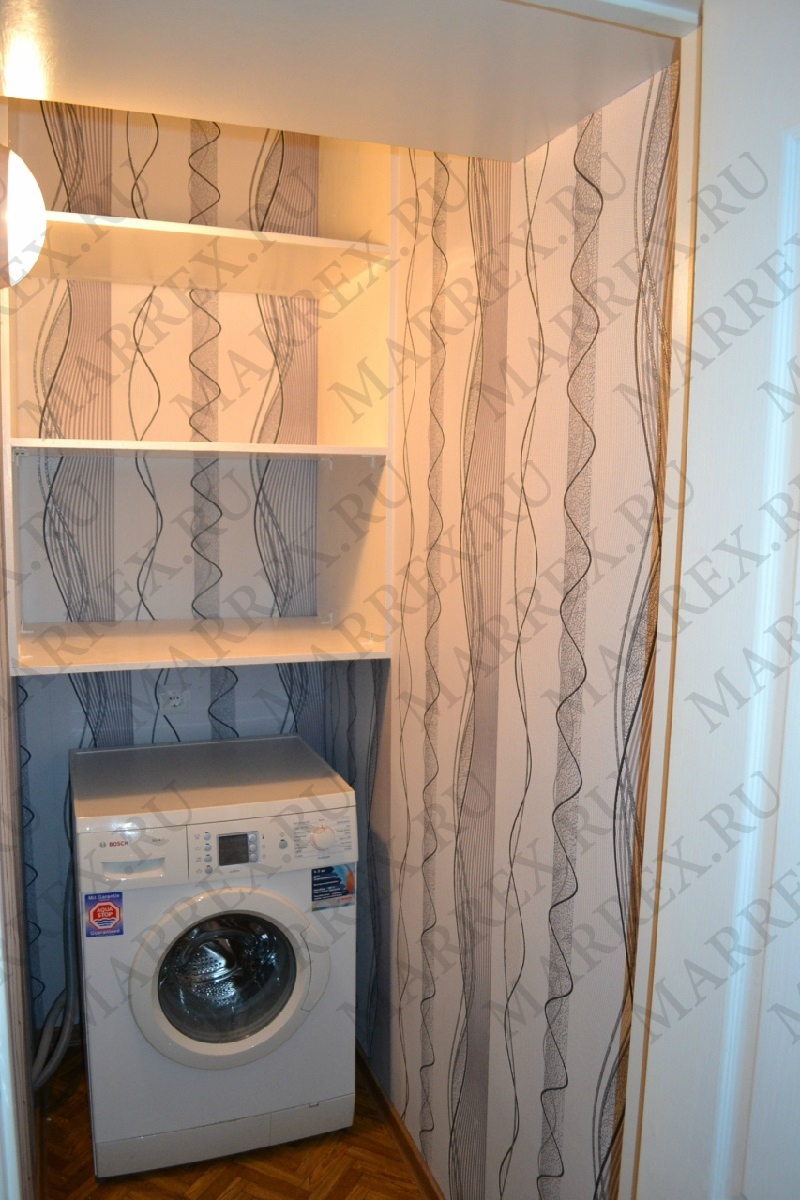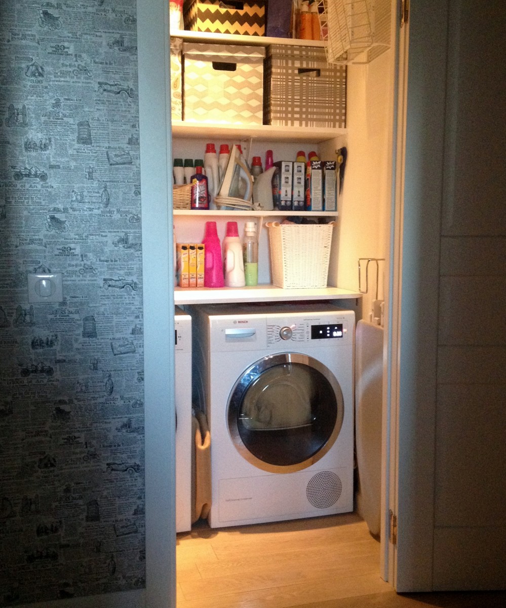 - Перфектен вариант мини пералня... Близо до стената беше поставена пишеща машина. Има рафтове за съхранение на перилни препарати и бельо, предвидени са сушилни.