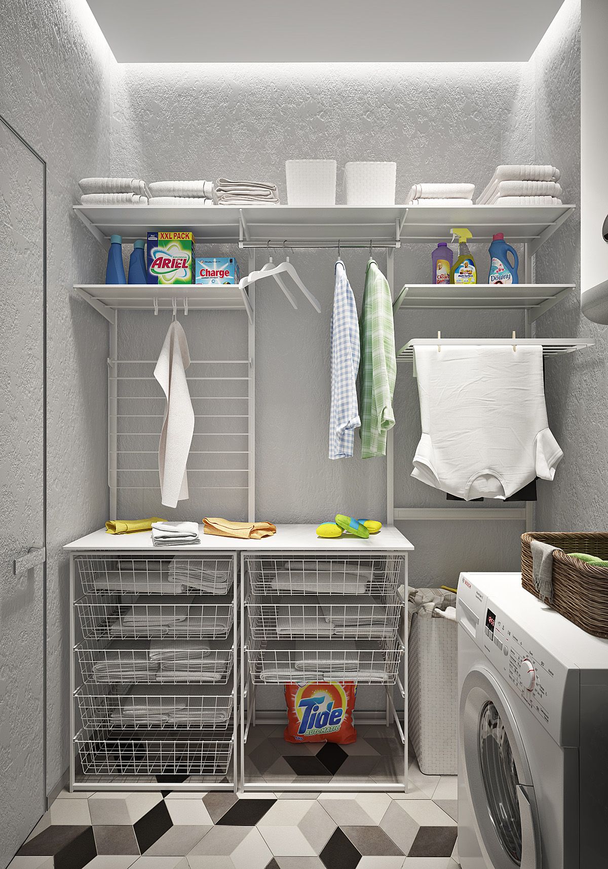 Кош за пране ще ви помогне да поддържате стаята подредена. Тук, ако има допълнително място, можете да поставите дъска за гладене и сушилня за дрехи.