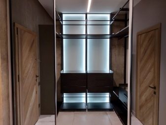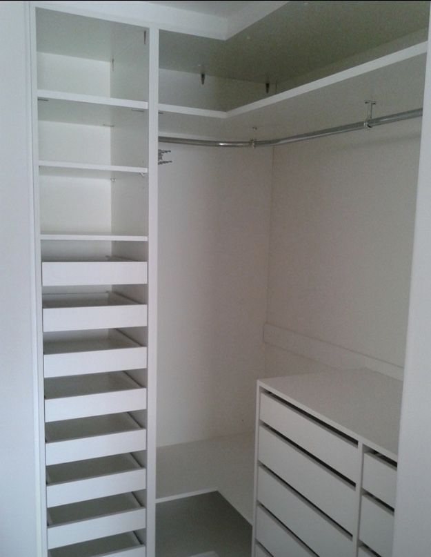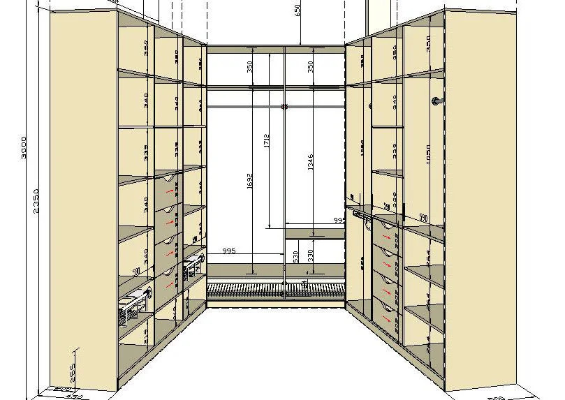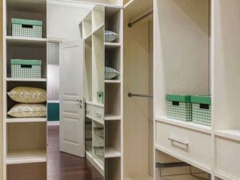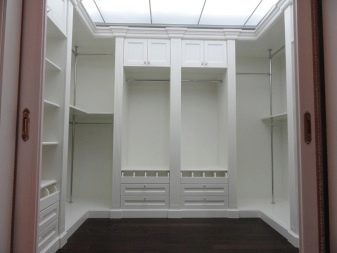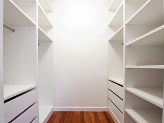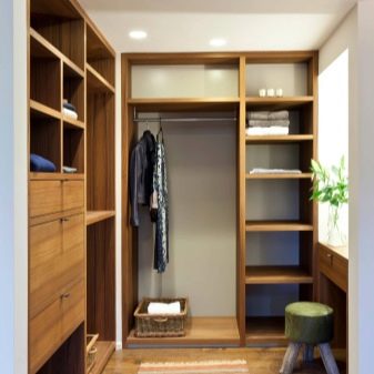 Първият вариант е по -подходящ за дълги стаи. Тук всички шкафове с рафтове са разположени по стените. В стаята има и голямо огледало. Мебелите не възпрепятстват свободното движение. Собствениците лесно намират нещата, от които се нуждаят.