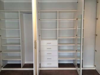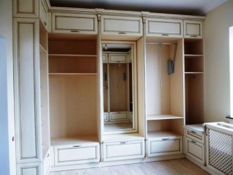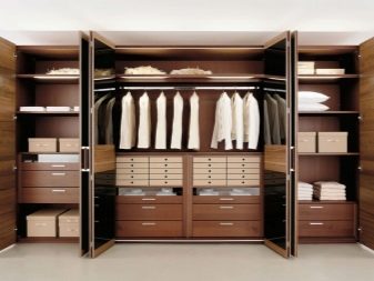 Вътрешното пълнене на мебели може да бъде разнообразно. Можете да закупите модификация с удобни рафтове, отделения, изтеглящи се чекмеджета. Всички те ще осигурят спретнато съхранение на нещата.