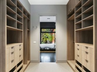 Паралелното оформление има своите предимства, това е отличен избор за просторни стаи. В този случай шкафовете могат да се монтират един срещу друг. Голям брой неща ще се поберат в такава съблекалня. Може да бъде оборудван с гардероб. Той ще украси стаята с външния си вид и ще осигури място за съхранение на различни предмети, включително връхни дрехи.