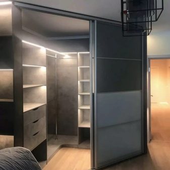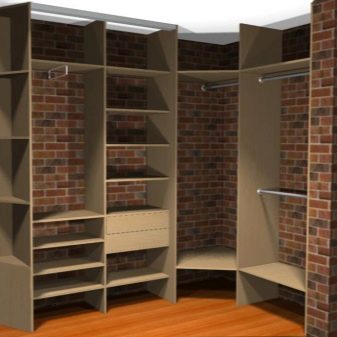 В случай на ъглово оформление се използва модификация на ъглов шкаф. Основната характеристика на такива мебели е, че те се намират в ъгъла. Шкафовете от тази серия са просторни и ергономични, позволяват да се използва пространството, което често се оставя непотърсено. Това е важно преди всичко за малки помещения. Ако има допълнително място, можете да направите рафтове по стените. Чудесно е, ако в шкафа има различни чекмеджета, които осигуряват удобна работа на мебелите.