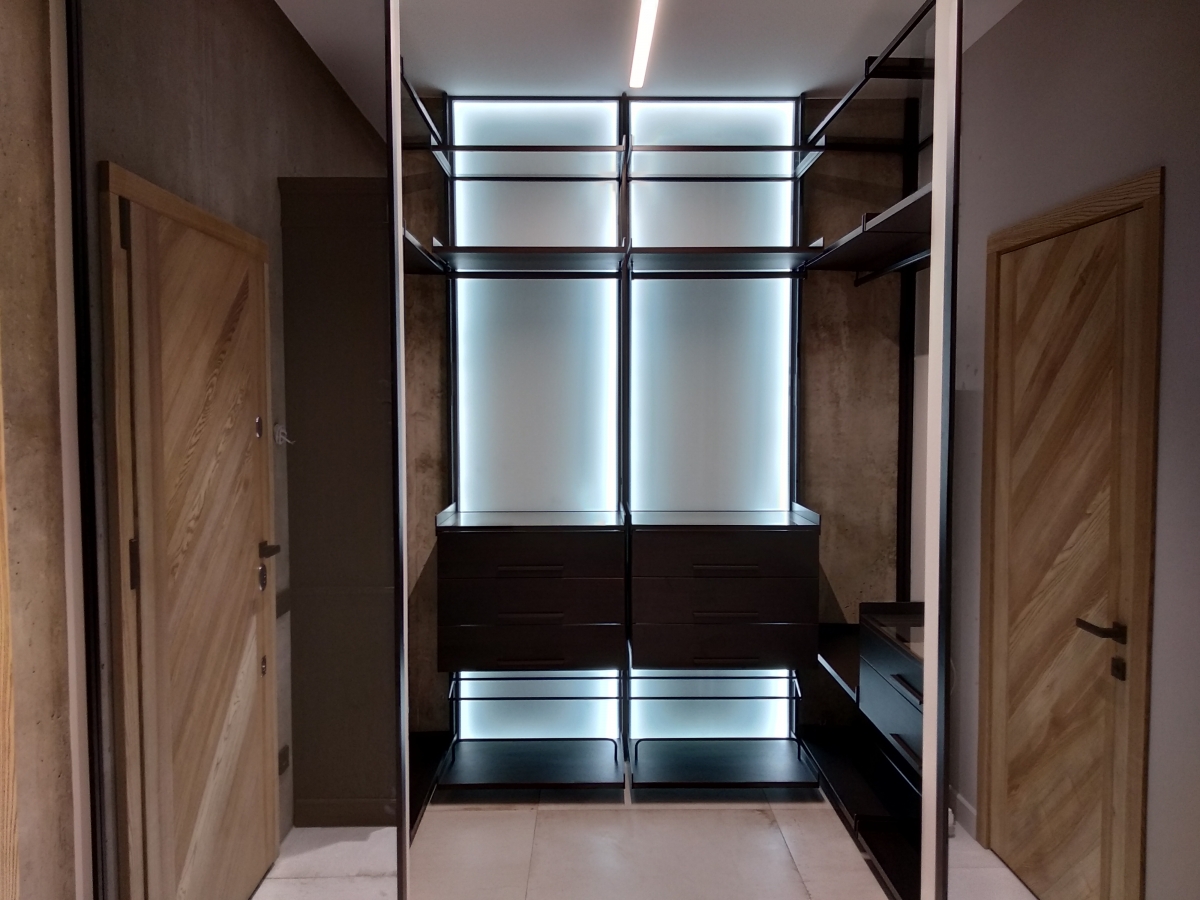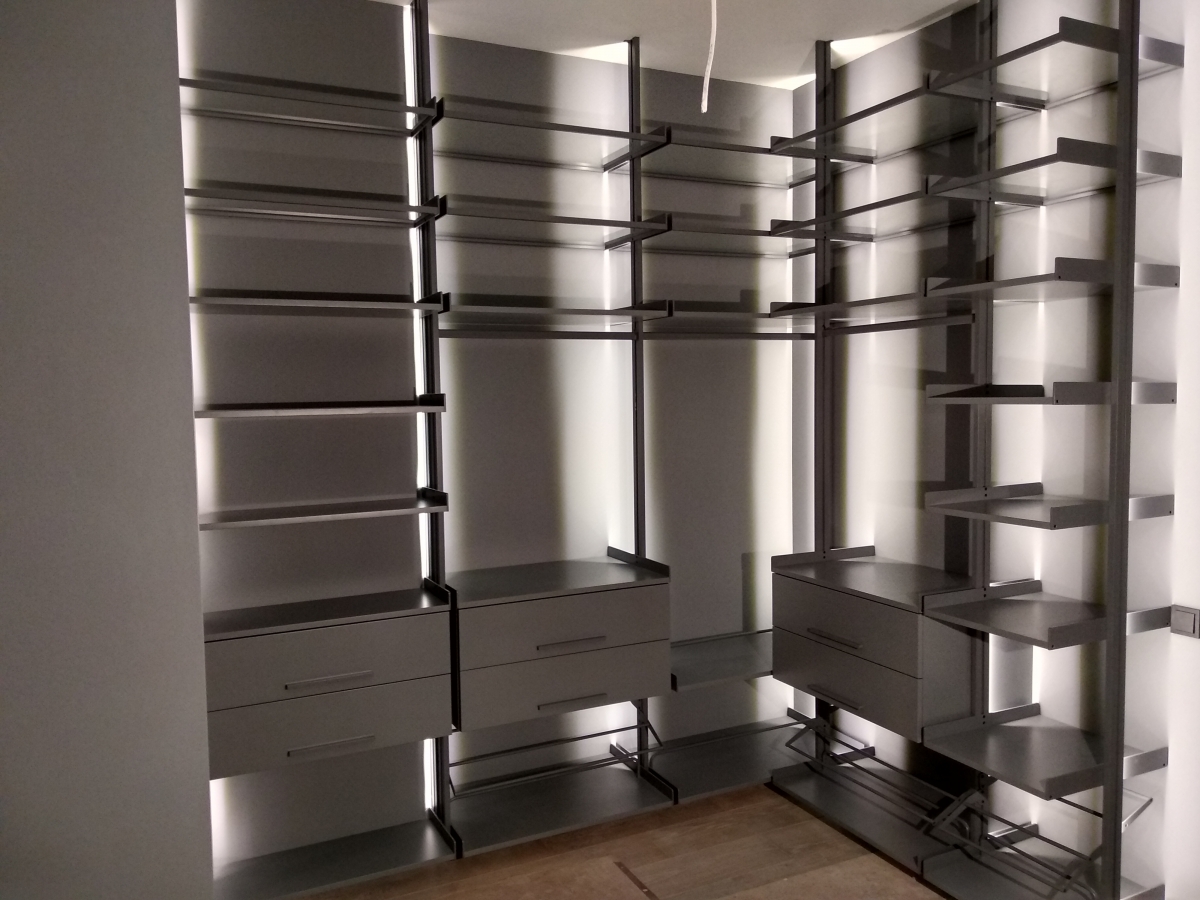 За дизайн на таванско помещение, алуминиевият вариант е перфектен. Основните елементи са щанги с пантографи, модули за съхранение на обувки, ботуши, малки аксесоари като ръкавици с шапки.