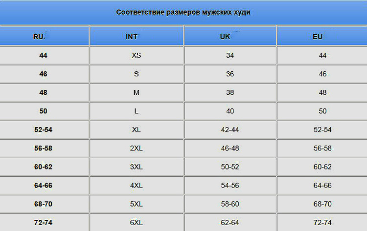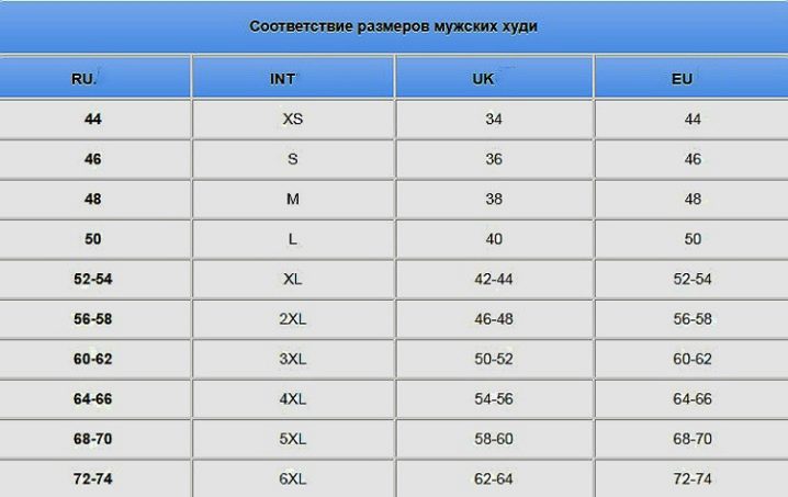 Мъжките качулки се шият в размери от 44 до 74, международните наименования съответстват на XS-6XL.