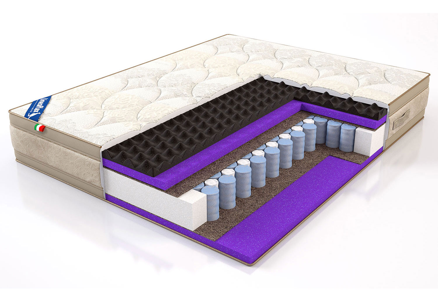 Що се отнася до модела на Микеланджело, той се предлага с "пружинна мултипакет" за 1000 пружини... Допустимото натоварване на продукт с височина 230 мм е 140 кг. Характерна за него е средната повърхностна твърдост. Независимите пружини имат плътност от 520 броя на кв. м. Легналите получават еластична опора, което гарантира отлична релаксация.
