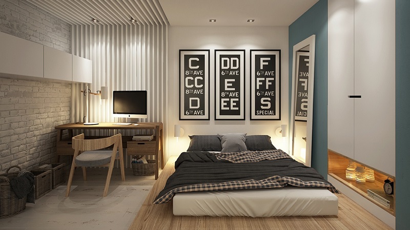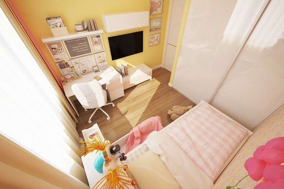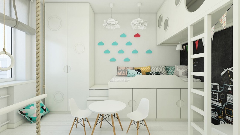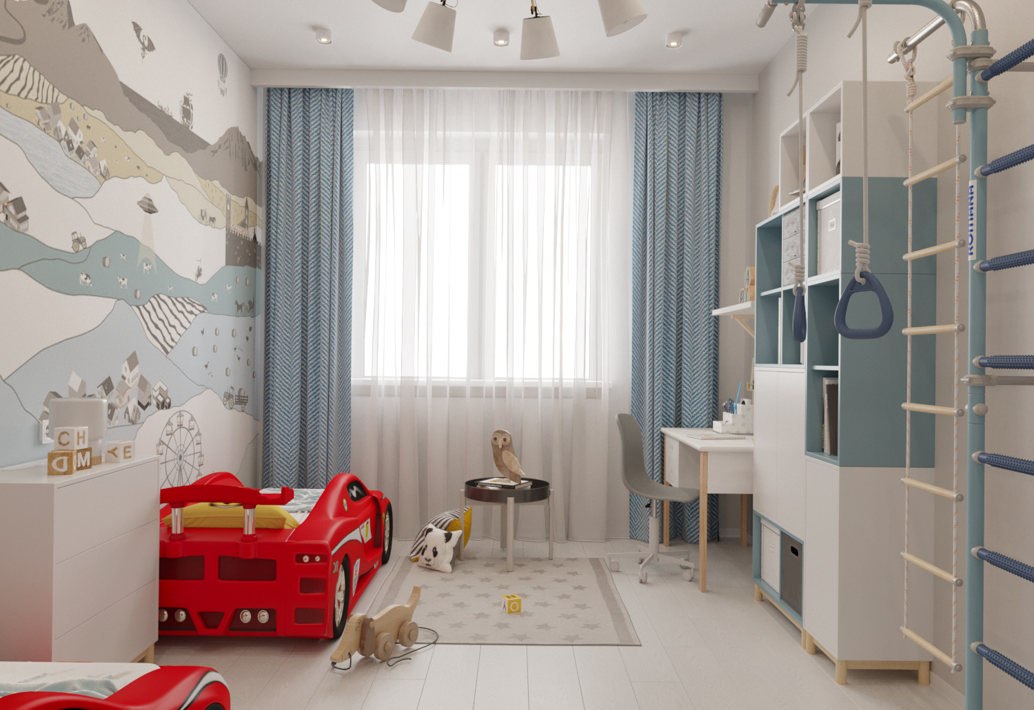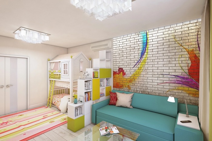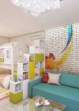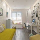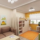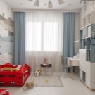 Ако детската стая не може да се похвали с големи размери, тогава тук можете да инсталирате двуетажно легло или отделни конструкции по стените. Необходимо е също така да се обмисли игрална или работна зона в зависимост от възрастта на детето, рафтовете за книги и спортния кът. Идеалният цвят за декориране на стая е син, който допринася за създаването на спокойна среда, която е важна за едно дете.