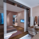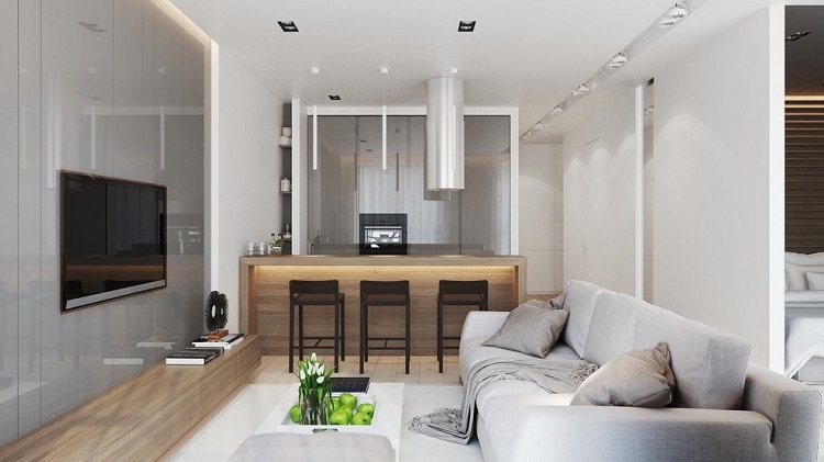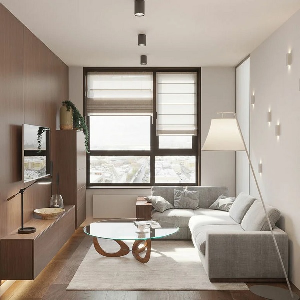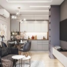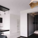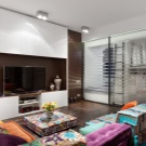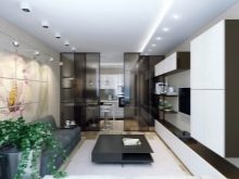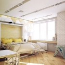 - Минимализъм. Характерна особеност на този стил е лаконизмът и липсата на ненужни елементи. В същото време такива интериори в двустаен или едностаен апартамент изглеждат изключително интересни и привлекателни, особено ако го проектирате в една цветова схема. И за да бъде интериорът интересен, е необходимо правилно да се поставят акценти, което е от немаловажно значение, като се има предвид минималният брой цветови решения в стаята. Сред акцентите, които ще насочат вниманието, са възглавниците, завесите и фасадите на мебелите. Идеалното обзавеждане се счита за модулно, което се характеризира с максимална простота и сдържан външен вид.