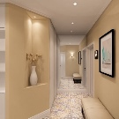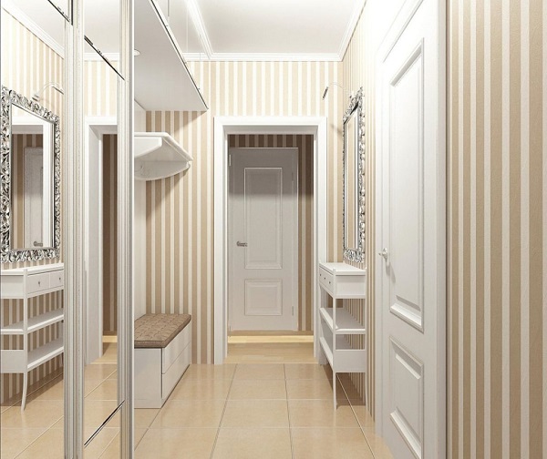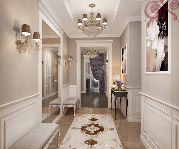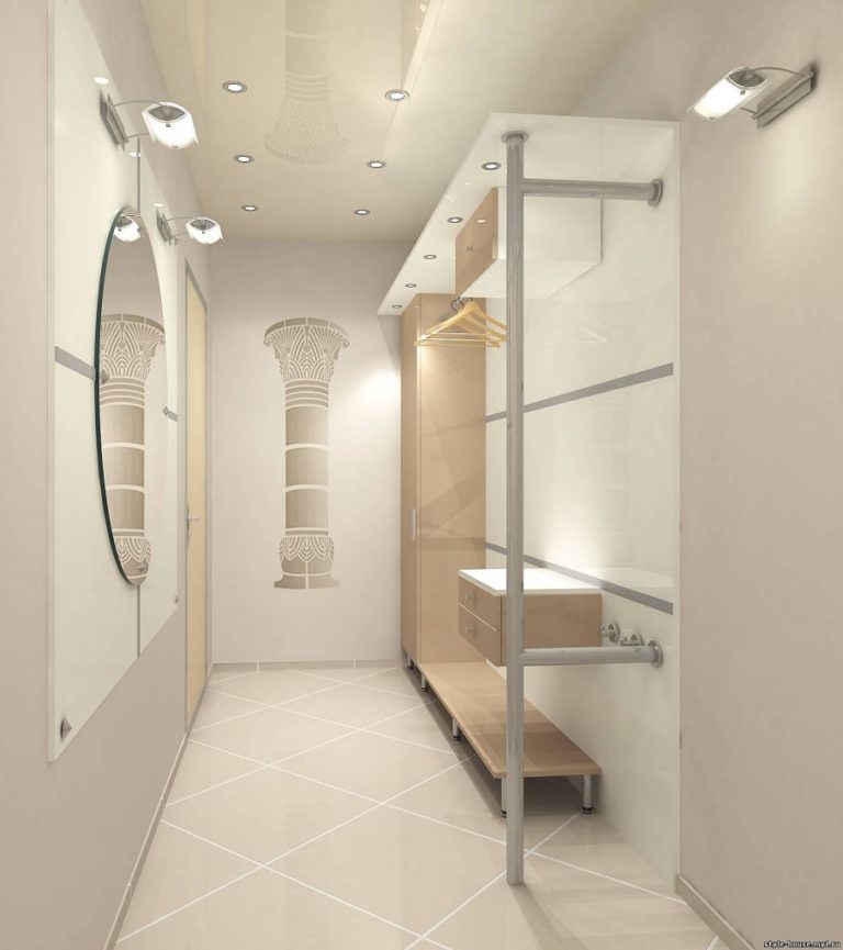 Стените в коридора са най -добре завършени в бели или бежови тонове, които осигуряват достатъчно осветление. Ако трябва визуално да увеличите височината на тавана, тогава е най -добре да използвате окачени конструкции, които могат да се похвалят със скрита система за осветление. Най -добре е да откажете големи декоративни елементи; дребният шрифт ще бъде идеалното решение. Ако коридорът е достатъчно тесен, няма нужда да инсталирате никакви шкафове или коридори, тъй като това ще разруши ефекта от едно пространство.