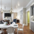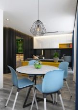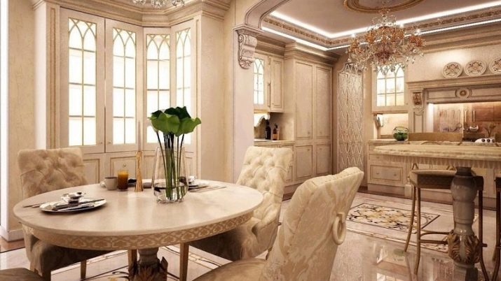 Ако в кухненската стая има достатъчно свободно пространство, тук можете да инсталирате размерни слушалки и маса за хранене за цялото семейство. В този случай обаче е необходимо да се вземе предвид фактът, че трябва да има място за хладилник, печка и други домакински уреди.