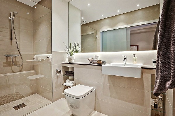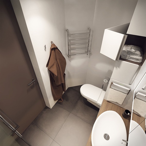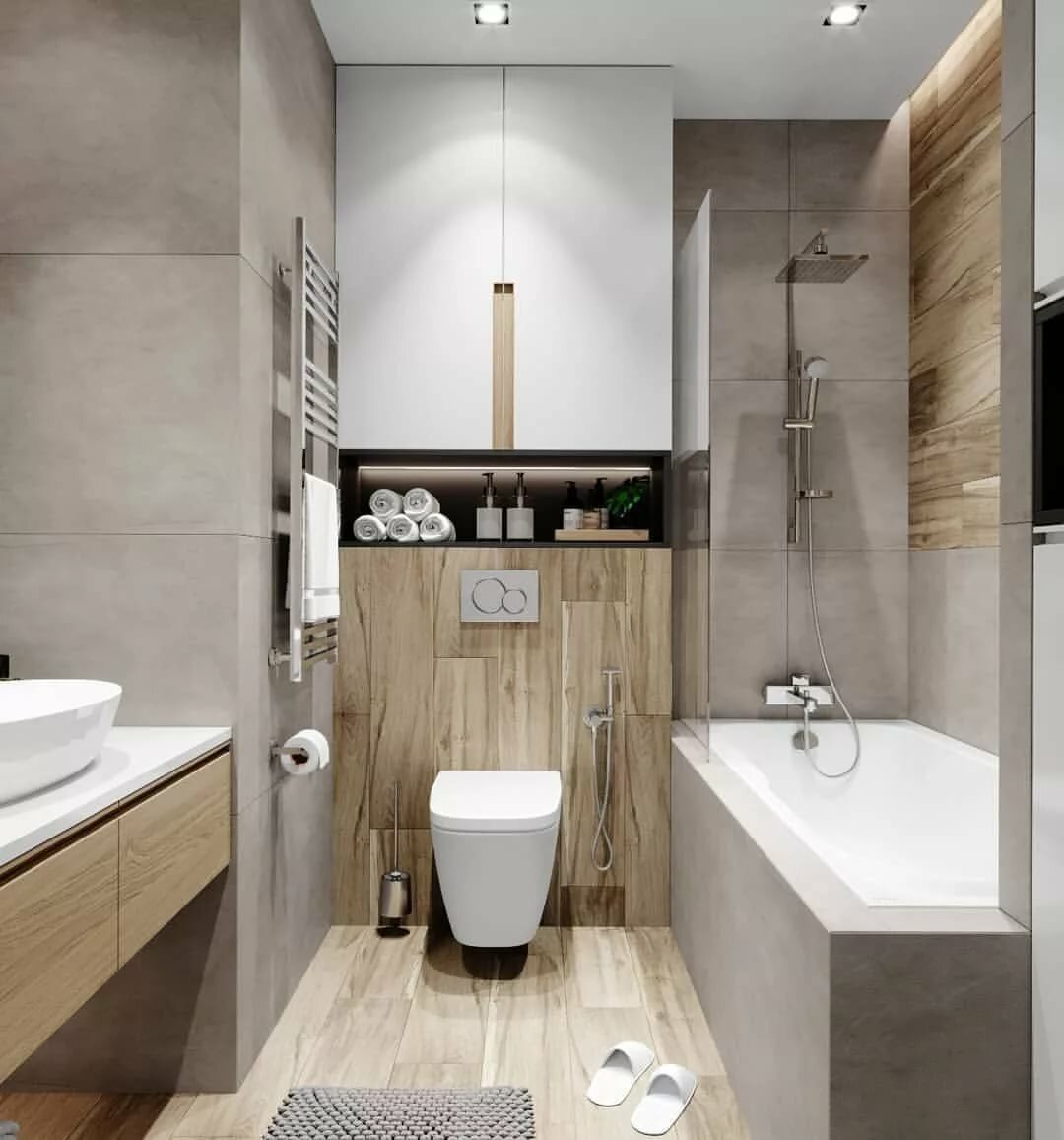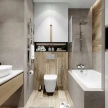 Ако остава място, то може да бъде украсено с малки чекмеджета и нощни шкафчета, които ще ви бъдат полезни във всяка баня. Ако се вземе решение за напускане на банята, тогава пространството под нея може да се превърне в малка система за съхранение. Тук ще можете да съхранявате домакински химикали, мръсни дрехи или други подобни аксесоари. Ако в банята има ниша, можете да инсталирате пералня в нея, която е скрита с помощта на специални чекмеджета и нощни шкафчета. Що се отнася до цветовата схема, в процеса на декориране на баня много често се използват светли плочки, а също така са разположени и няколко големи огледала, което визуално увеличава пространството.