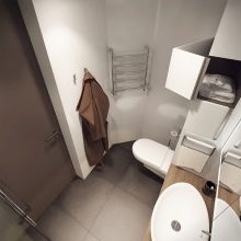 В повечето случаи апартаментите с площ от 50 квадратни метра имат комбинирана баня. Той не може да се похвали с големи размери, така че тук е най -добре да се ограничите до използването на малка мивка и тоалетна, но най -добре е да откажете баня. Душ кабина ще бъде идеална замяна, която не само спестява място в банята, но и може да се похвали с гъвкавост.