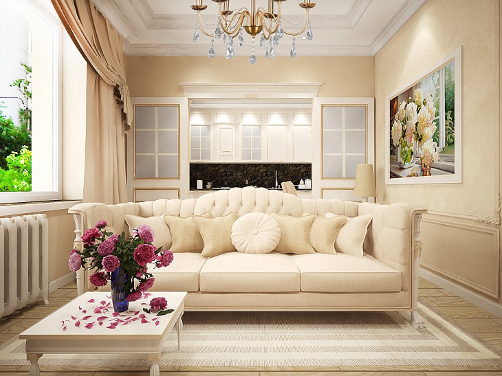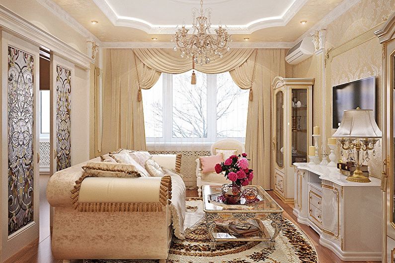 Класически. Особеността на тази посока е наличието на ясни форми и симетрия. Тук не се допускат много цветове, а декоративните елементи трябва да са възможно най -изразителни. В повечето модерни интериори, декорирани в класически стил, централният елемент е полилей, както и завеси. Необходимо е да се украси такъв интериор по такъв начин, че да прилича на британско имение. Високите тавани са основната характеристика на класическия интериор. Ако стаята не може да се похвали с такава, тогава можете визуално да увеличите височината, като използвате специално осветление.Такъв интериор предполага наличието на разнообразни мебели, както и различни елементи, вградени в нишата.
