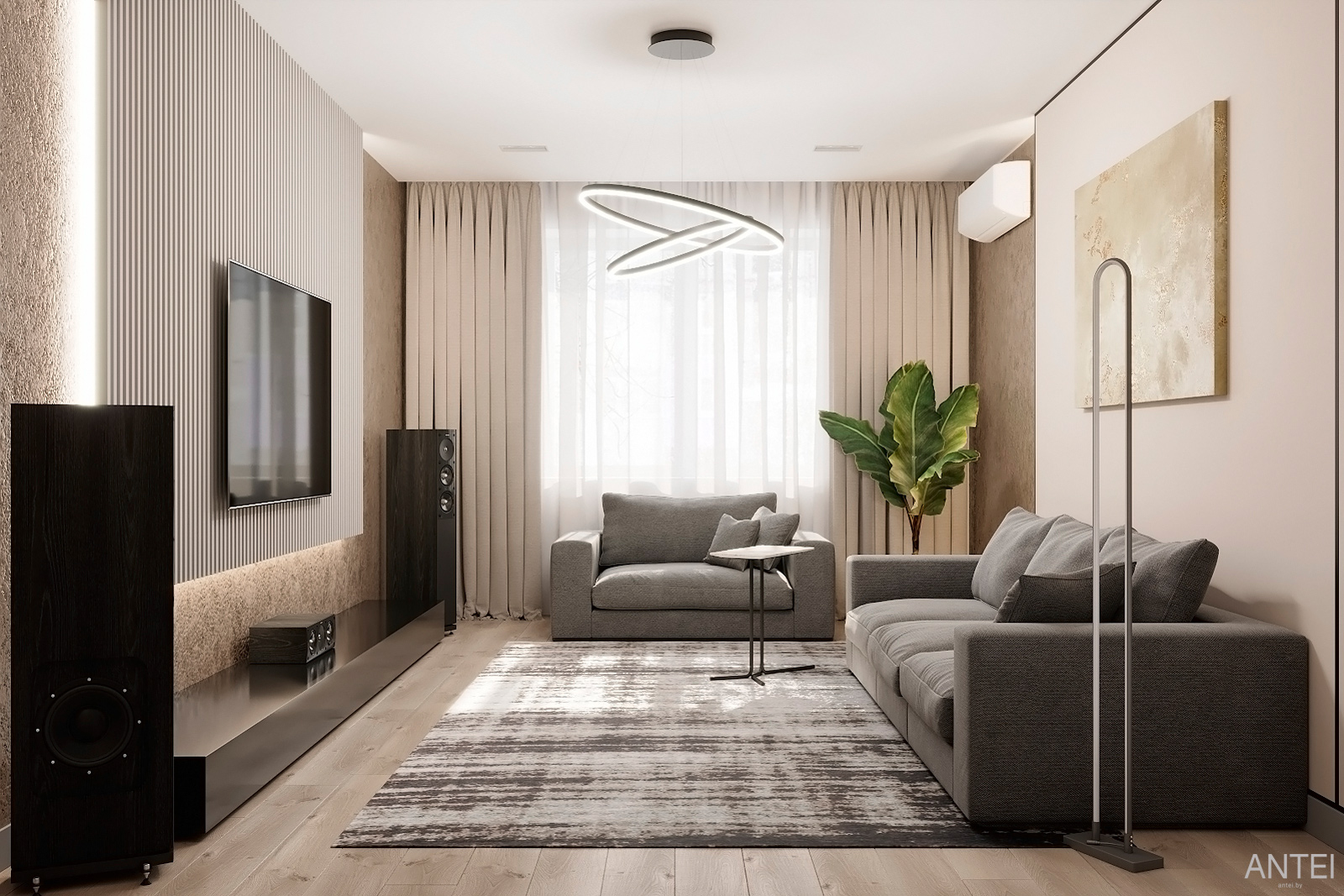 - Всекидневна в модерен стил, който е разделен на няколко функционални области.