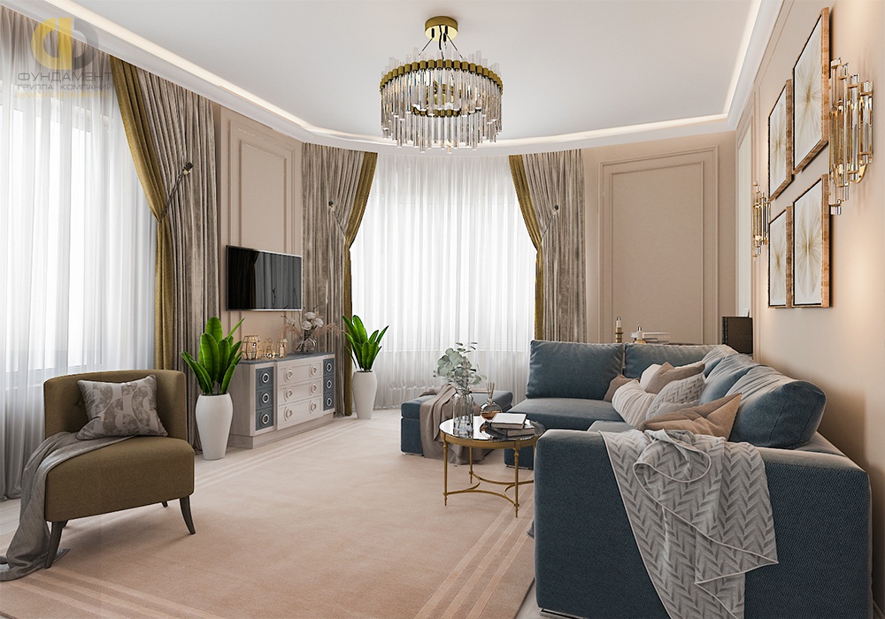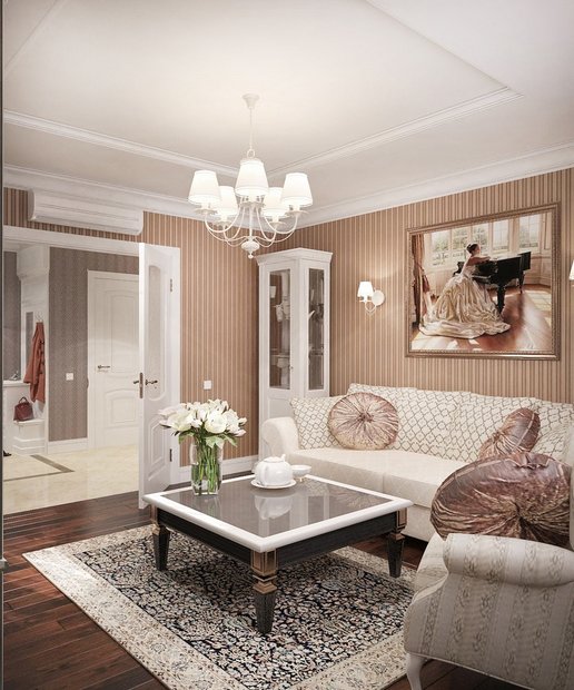 Класически стил, който все още се счита за най -популярния и универсален. Той включва използването на мебели с големи размери, различни корнизи от мазилка и голям кристален полилей.