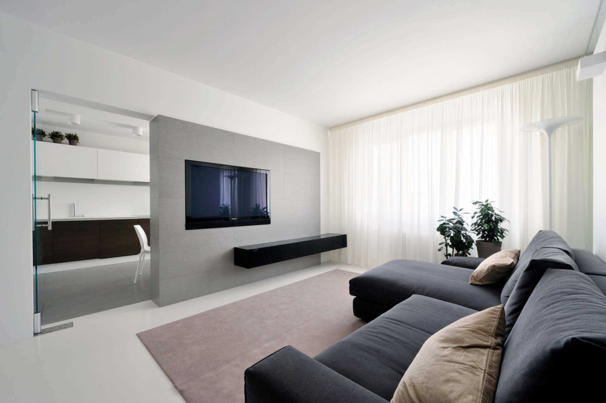 - Интериорът на апартамента, декориран в стила на минимализма. Стените са боядисани в една цветова схема, а обикновените картини се използват като декоративни елементи.