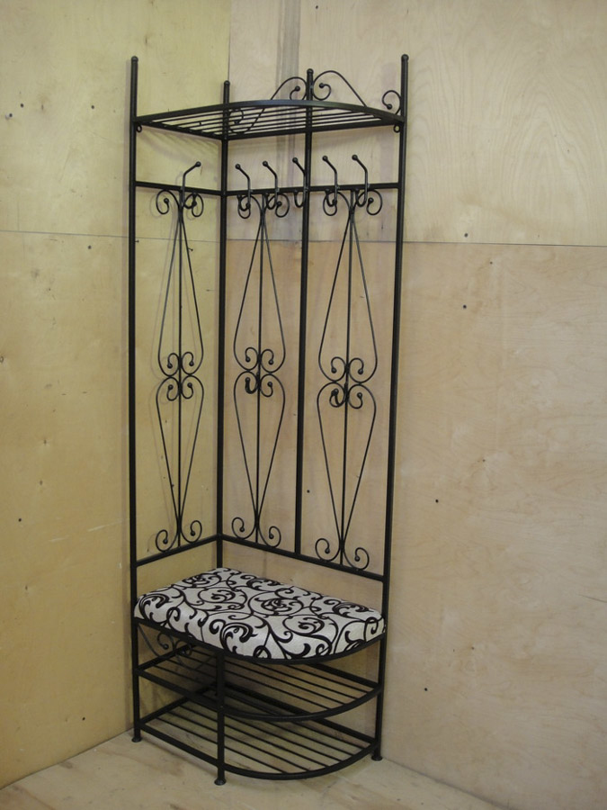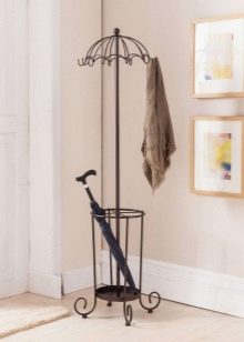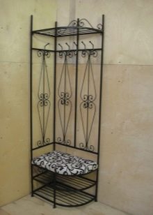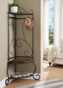 Друг вариант, който ви позволява да спестите свободно пространство в малък апартамент. Ъгловите закачалки са не само компактни, но и лесни за използване и могат да се похвалят с добър капацитет. За да им придадат по -изразителен вид, занаятчиите използват ковани къдрици, усукани пръти и други декоративни елементи. Някои продукти могат да бъдат оборудвани с огледала, поставки за обувки, седалки и др.
