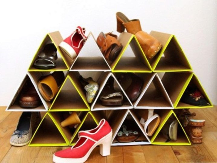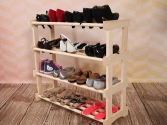 Домашен модел обувки може да бъде направен не само прав, но и с ъглов дизайн. Може да побере рафтове до човешки ръст. Препоръчително е да го прикрепите към стената с дюбели.