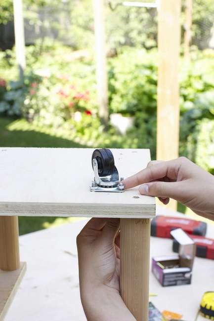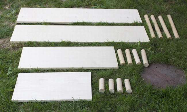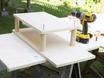 Първо се прави чертеж на продукта. Размерите се прехвърлят върху плоскостите или листа от ПДЧ, точките за закрепване са маркирани. Детайлите се изрязват с мозайката или ножовка. В ъглите на рафтовете се пробиват кръгли дупки. Калибрирани пръчки се прокарват през тях, свързвайки дъските помежду си. Конструкцията се закрепва със самонарезни винтове или винтове за мебели. Стелажът може да бъде направен на крака или на колела.