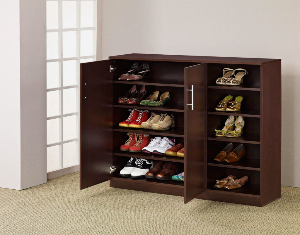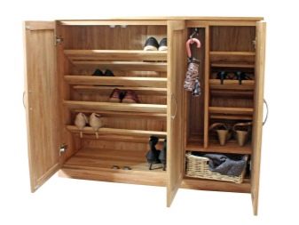 Изработката на шкафа ще отнеме повече време и усилия. Първо, рамката се сглобява. След това се монтират вътрешните елементи, рафтовете и задната част на шкафа. Монтиран е заключващ механизъм (панти), окачени са врати с дръжки. Гардеробът може да бъде направен до тавана, тогава всички обувки ще се поберат в него. Вътрешните рафтове могат да се накланят (спестяват място в шкафа), да се плъзгат или сгъват. Съдържанието на шкафа ще бъде скрито от любопитни очи. Тези рафтове са чудесни за коридори с голяма площ.