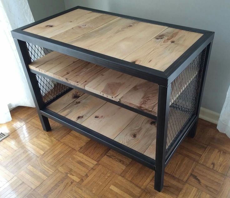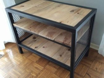 - Страните и рамката са изработени от дъски, а рафтовете са от плат, метална мрежа, тел, тънки метални тръби.