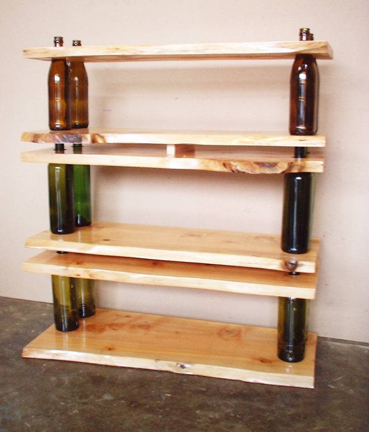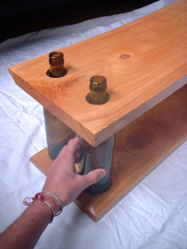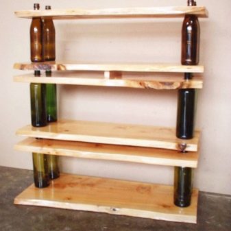 Вземат се четен брой бутилки с прибрано дъно, отлепени от етикета на хартията. Отворите са направени в дъските или ПДЧ, за да отговарят на размера на гърлото. Структурата е сглобена в едно цяло. За рафт на две нива са ви необходими 8 бутилки и 4 дъски.