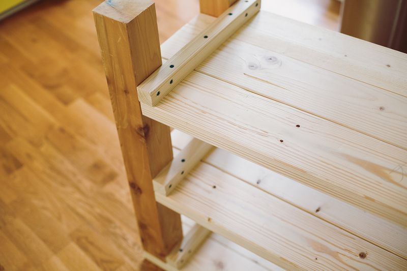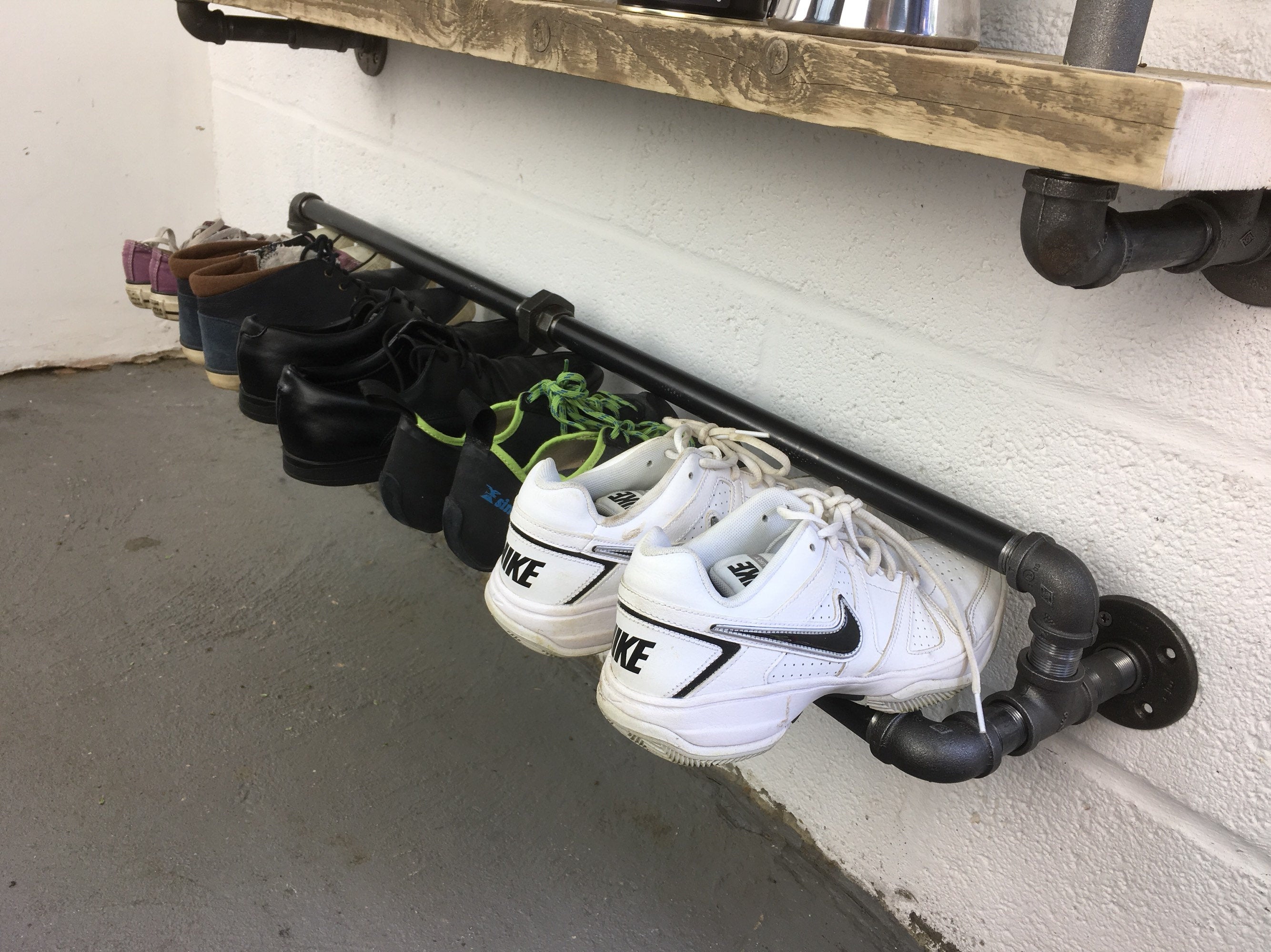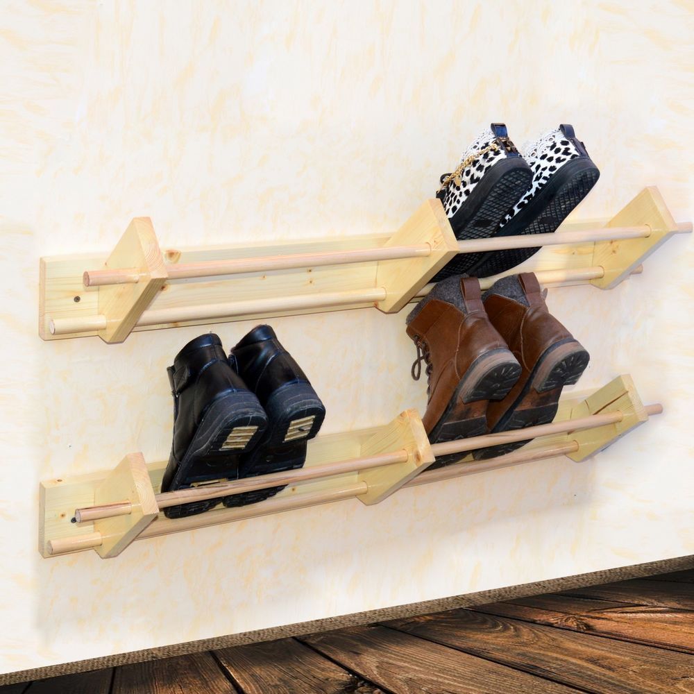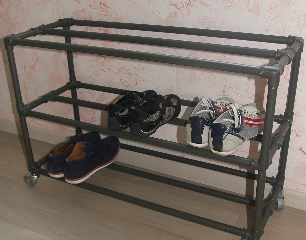 В стойката рафтовете и страничните стени са изработени от дъски, ПДЧ или палети. Конструкцията е свързана със самонарезни винтове или винтове за мебели. Той е стабилен, защото има голямо тегло. Височината на рафтовете зависи от височината на обувките, които ще се съхраняват върху тях.