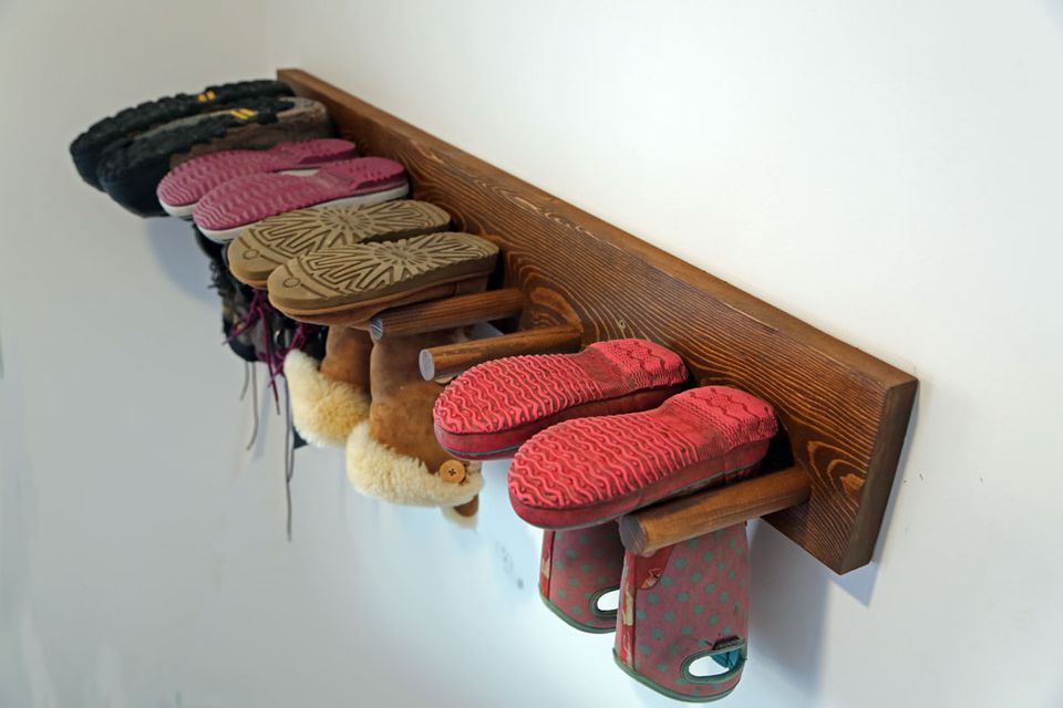 От дъска и мебелни дюбели можете да направите рафт, където ще висят обувките. За това в дъската се пробиват дупки. Дюбелите се забиват в тях с чук. Остава само да закачите рафта на стената. Обувките са окачени.