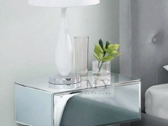 Висящите нощни шкафчета със стъклени детайли изглеждат леки и ефирни. Такива продукти са чудесни за помещения, декорирани в минималистичен или високотехнологичен стил. За да създадете такива мебели, можете да използвате матирано, емайлирано или ламинирано стъкло. Продуктите, състоящи се от голям брой цветни части, изглеждат красиви.