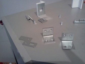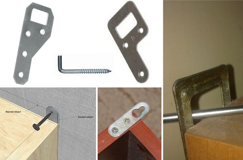 Този метод на инсталиране се счита за бюджетен. Но в същото време този процес отнема доста време. Пантата, използвана за закрепване на шкафа, е здрава метална плоча с прорези. Той е прикрепен към задната част на нощното шкафче. В стената се завинтва здрав винт, върху който са окачени мебелите. За да може всичко да мине без проблеми, е необходимо предварително да се направят измервания и да се подготви за монтажа на бордюра.
