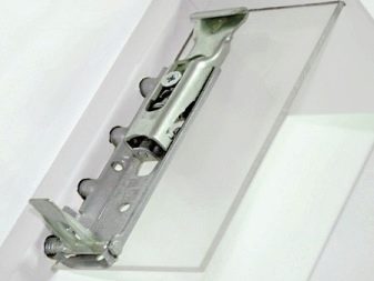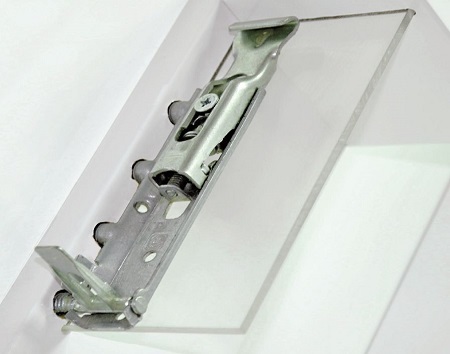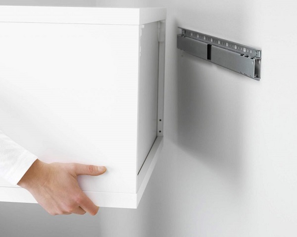 Този метод на монтаж е по -прост. Монтажната плоча се състои от перфорирана релса и панта. Последният е прикрепен към вътрешната повърхност на страничните стени на шкафа. В този случай куките се простират отвъд задната стена. Релсата се монтира към стената върху здрави дюбели със самонарезни винтове. След това върху монтажната плоча се фиксира шарнирно нощно шкафче.