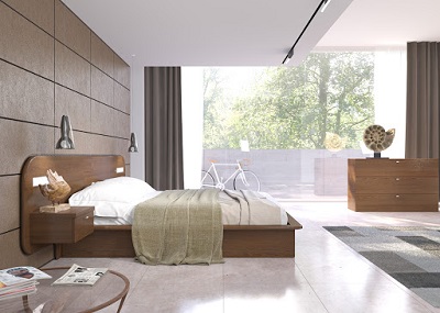 Когато декорирате модерна спалня, можете да изберете висящ шкаф от всякакъв вид дърво.