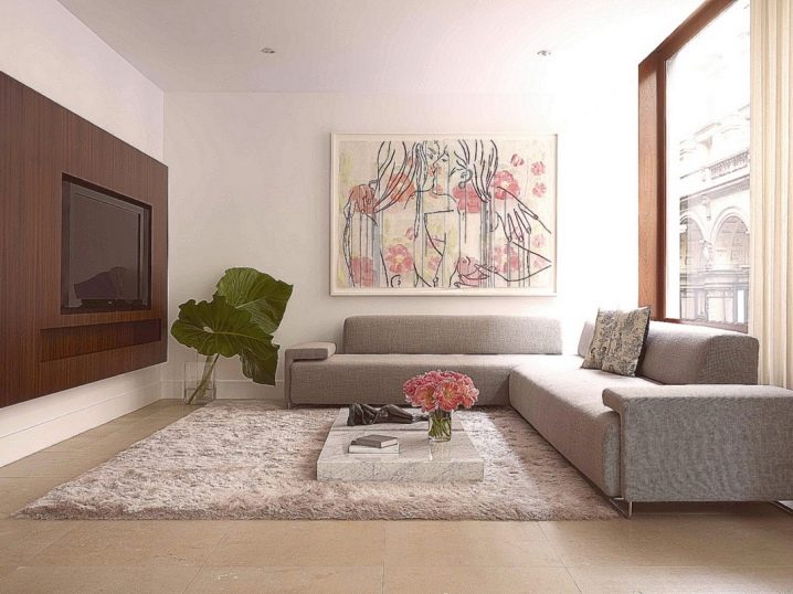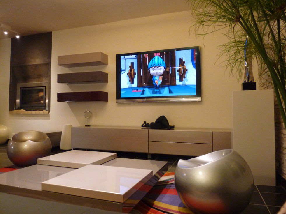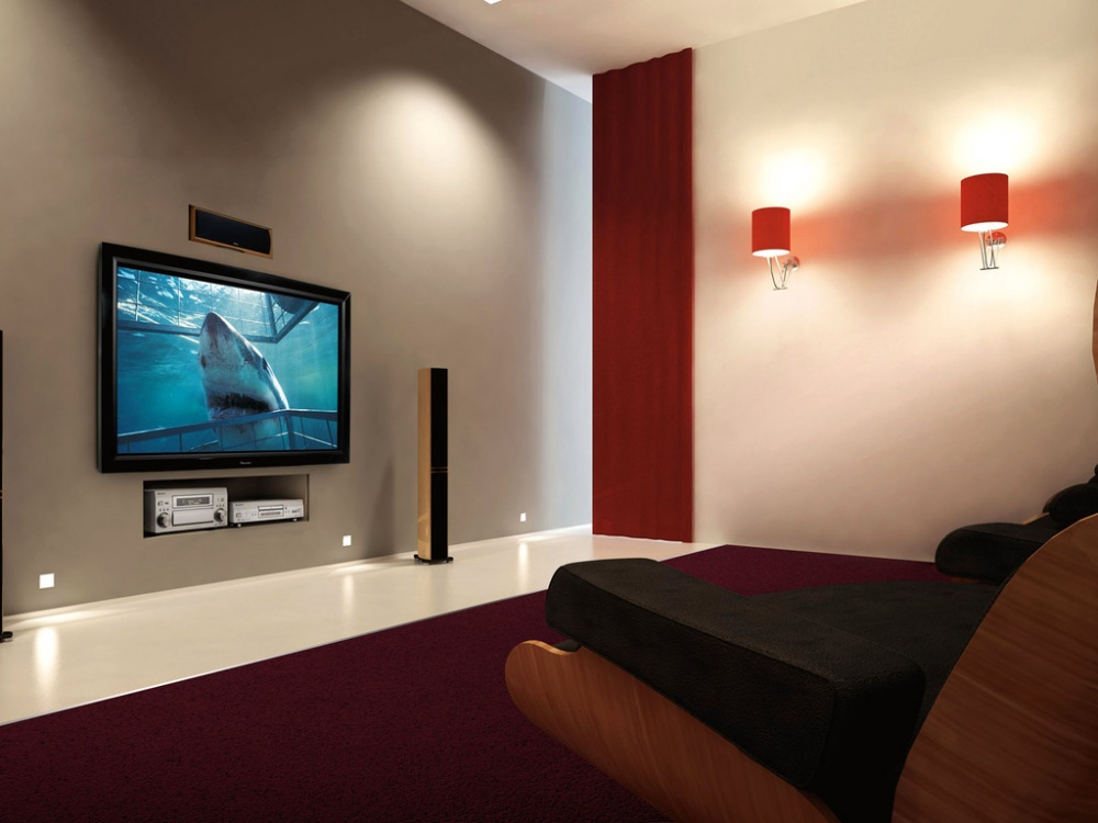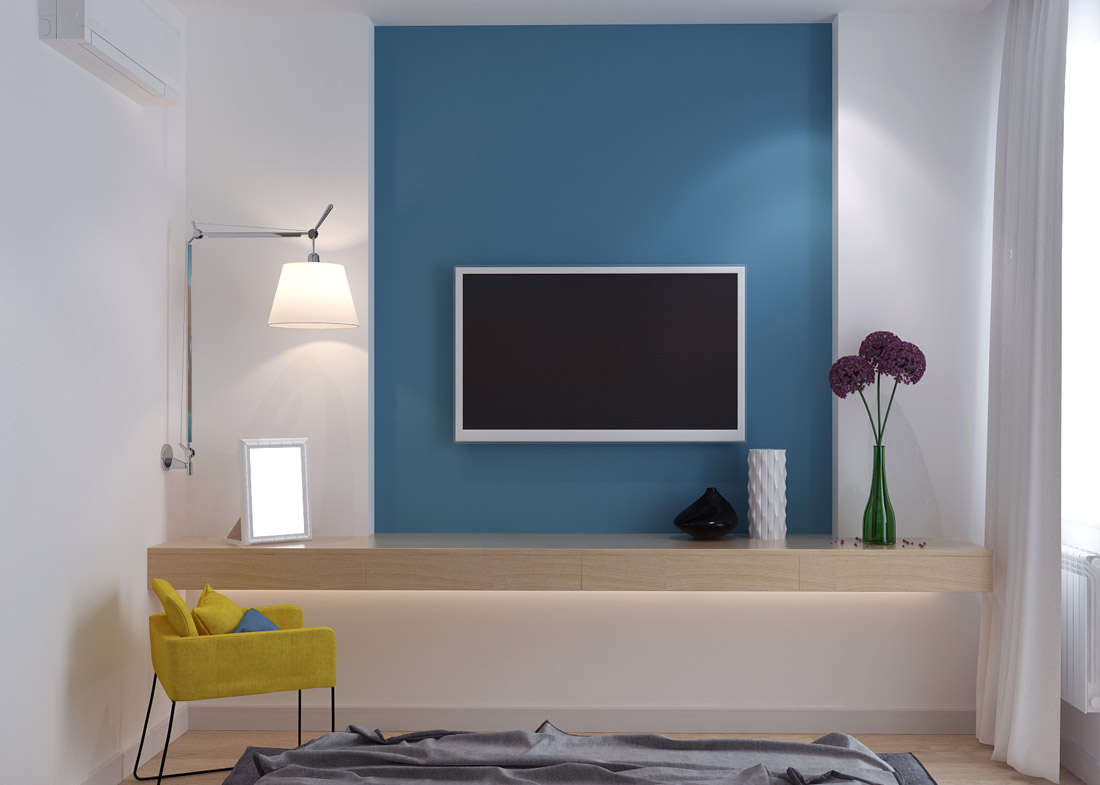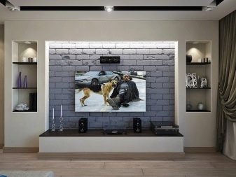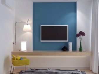 - Стенният телевизор може да се превърне в ключов елемент от интериора. Може да се използва като цветен декоративен елемент. За да привлече вниманието към технологиите, стената, на която е инсталиран мониторът, е украсена с ярки цветове. Когато избирате цветова схема, трябва да изберете нюанси, които ще се комбинират помежду си.Стилът на интериора също се взема предвид, защото за всяка посока е характерен определен набор от цветове.